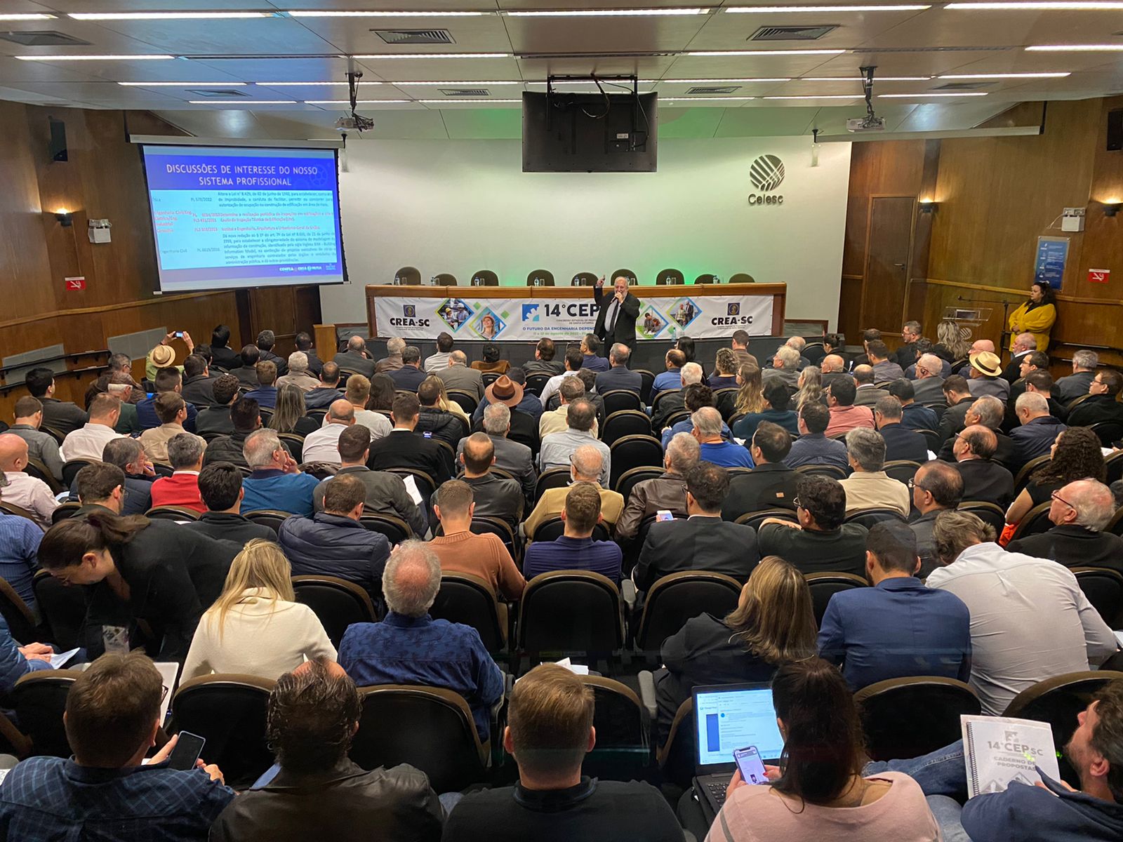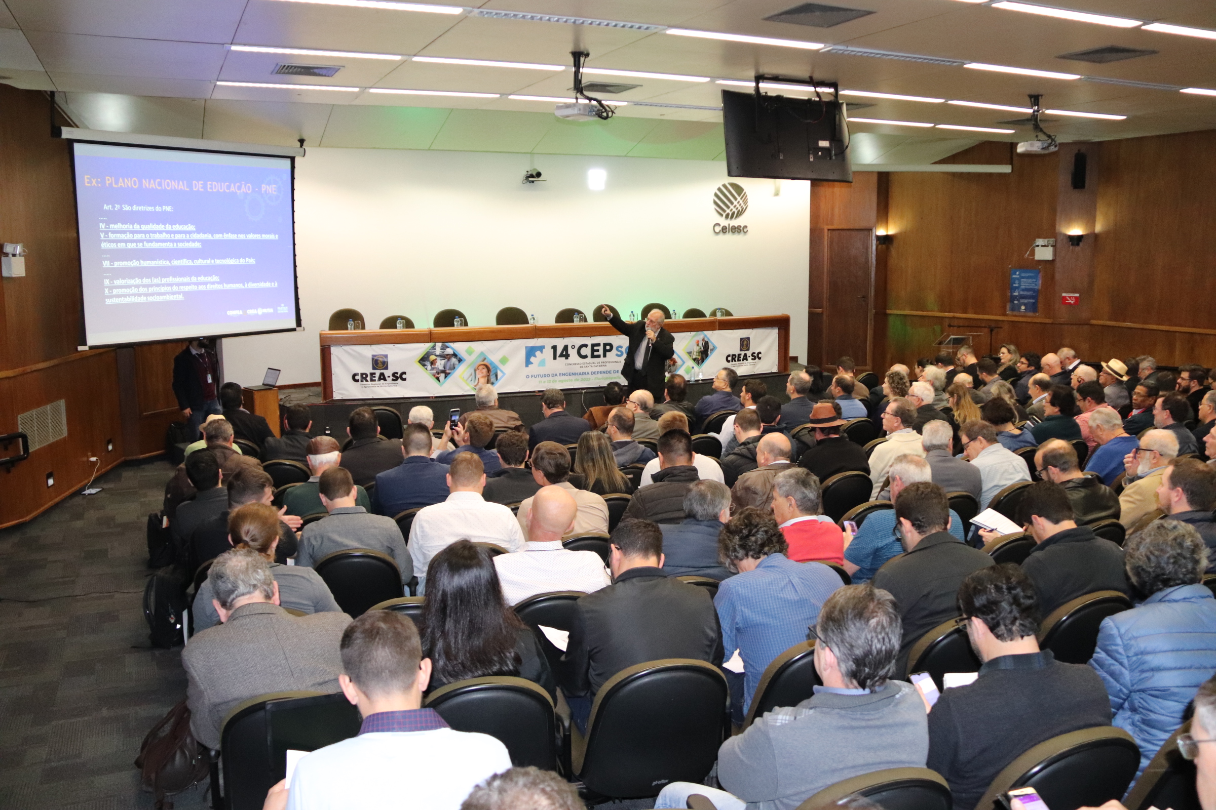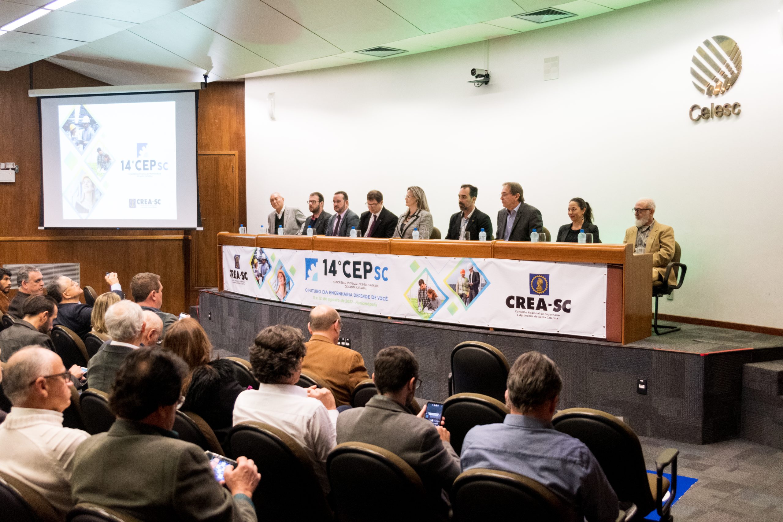 Cerca de 200 profissionais, entre conselheiros, diretores e assessores participaram nessa quinta e sexta-feira, 11 e 12 de agosto do 14º Congresso Estadual dos Profissionais (CEP), realizado pelo CREA-SC no auditório da Celesc. Exclusivamente destinado aos delegados natos e aos eleitos nos 22 encontros regionais preparatórios que foram realizados nos meses de abril, maio, junho e julho, o congresso tem o objetivo de promover debates, colhendo sugestões que auxiliem no desenvolvimento de Santa Catarina e no aperfeiçoamento da legislação do Sistema. Durante os encontros foram aprovadas 146 propostas e duas moções e eleitos 111 delegados para representar o estado, além dos 143 delegados natos. Tais proposições foram sistematizadas pela comissão organizadora em 62 propostas e 10 moções, que foram analisadas e votadas neste CEP, e serão levadas ao 11º CNP, de 6 a 8 de outubro em Goiânia. As propostas foram analisadas de acordo com o tema central do evento: “Desenvolvimento nacional com implementação de políticas públicas para a Engenharia, a Agronomia e as Geociências”.