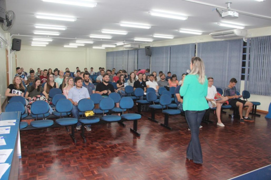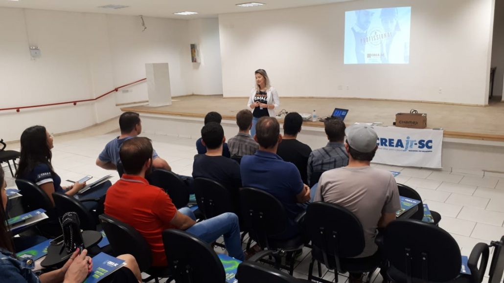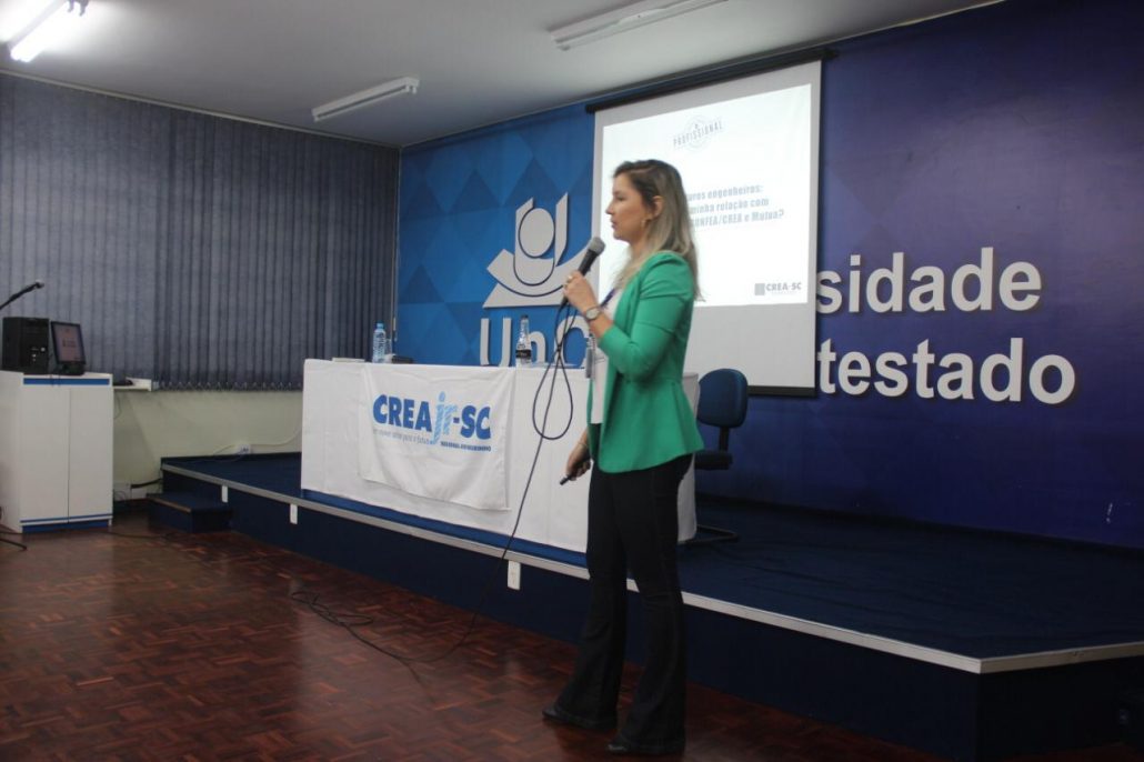 Com público de mais de cem acadêmicos, a assessora de apoio às instituições de ensino do CREA-SC, Eng. Civil Caroline Burtet, falou sobre o Sistema Confea/CREA e Mútua, sobre legislação e atribuição profissional e sobre a importância do registro e da Anotação de Responsabilidade Técnica Junior (ARTjr). As ações e projetos do Programa Creajr, a relação do CREA-SC e dos profissionais com as entidades de classe, a valorização e a fiscalização do Conselho foram outros temas em debate.