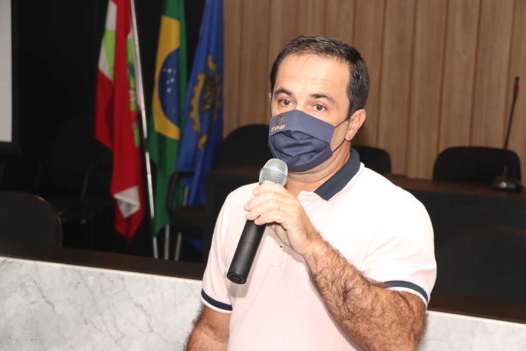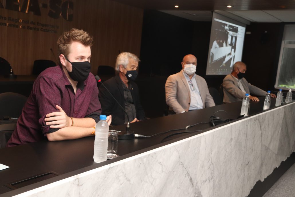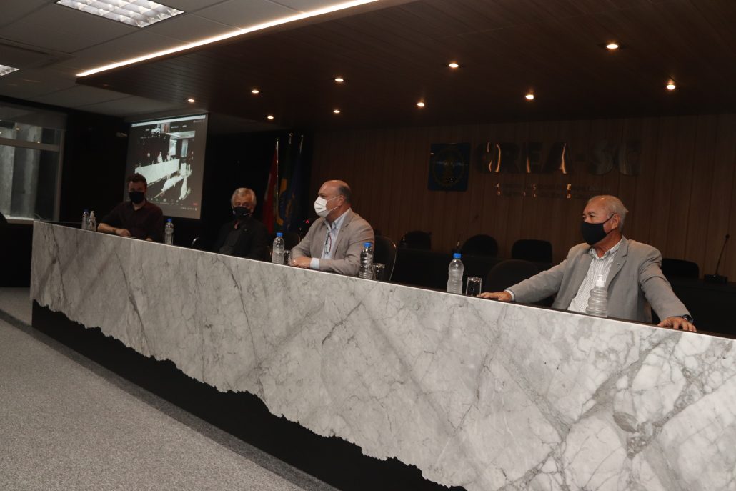 Além do presidente, Eng. Civil Carlos Alberto Kita Xavier, participaram na mesa diretora do seminário o Diretor Geral da Mútua-SC, Eng. Civil Carlos Nakazima, o coordenador do CDER, Eng. Agrim. Valdir Schneider e o coordenador do programa CreajrSC, Thom Nicolas.