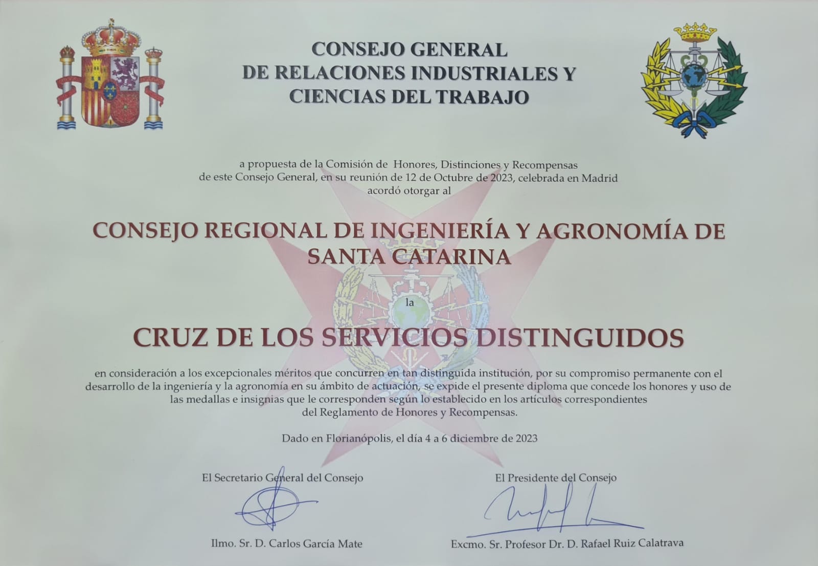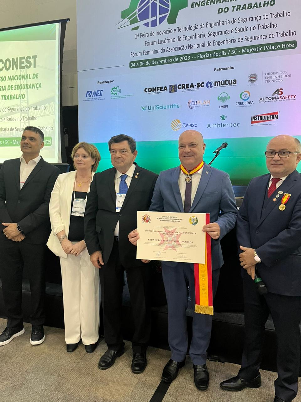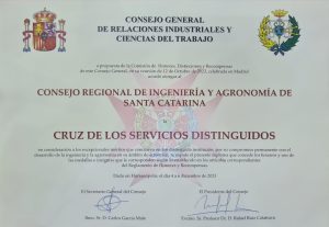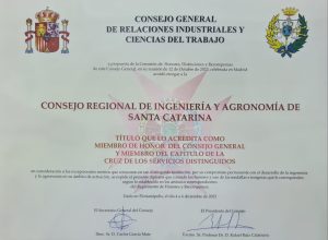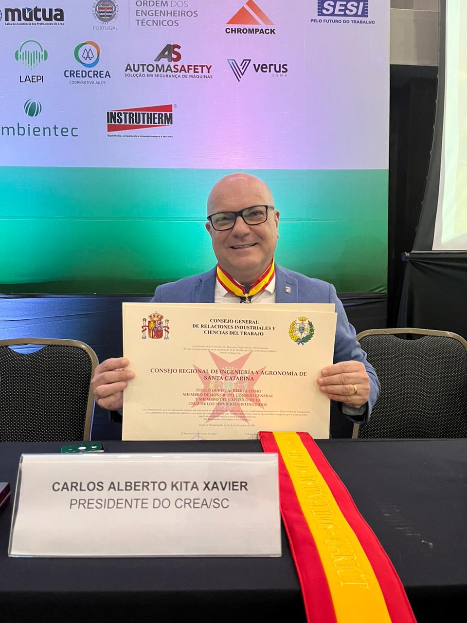 O presidente do Crea-SC, Eng. Civil e Seg. do Trab. Kita Xavier participou da abertura do Congresso e recebeu em nome do Conselho a outorga de “Miembro de Honor” e membro “Cruz de Los Servicios Distinguidos” em consideração ao compromisso permanente do Crea-SC com a engenharia e agronomia em Santa Catarina, a homenagem foi entregue pelo Conselho Geral de Relações Laborais e Ciências do Trabalho da Espanha.