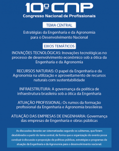 Fruto de tratativas do Grupo Técnico de Trabalho para apoio à Comissão Organizadora do 10º Congresso Nacional de Profissionais – CON10CNP, as recomendações foram aprovadas pelo plenário do Confea em 13 de fevereiro. Veja a íntegra da Decisão Plenária e das recomendações. Instituído em 11 de janeiro, o grupo técnico é coordenado pelo chefe de Gabinete do Confea, Luiz Antônio Rossafa, e composto pelo conselheiro federal Zerisson de Oliveira Neto e por funcionários do Confea representantes das áreas técnica, estratégica, administrativa e jurídica.