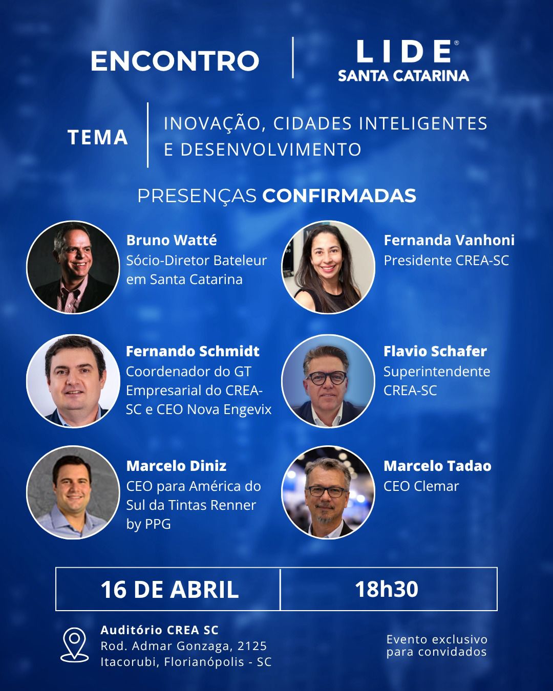 Nesta quinta-feira, ”Inovação, Cidades Inteligentes, e Desenvolvimento Econômico” será pauta do Painel LIDE Especial, na Sede do CREA SC, em Florianópolis. O encontro reúne  lideranças empresariais e institucionais para discutir sobre os caminhos para o crescimento sustentável e inteligente das cidades.