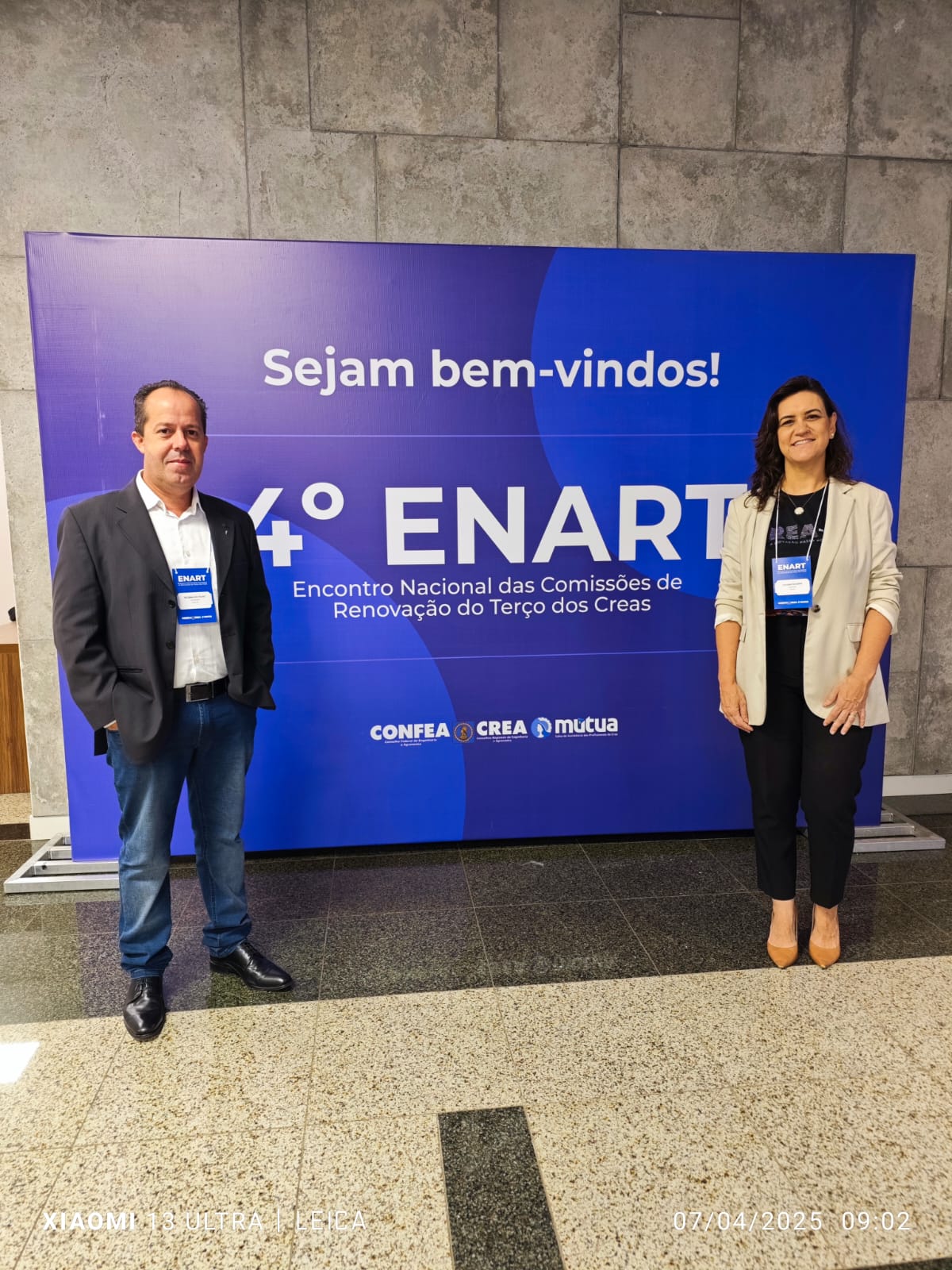 Representando o CREA-SC, o coordenador da Comissão de Renovação do Terço, Eng. Ftal. Reginaldo Rocha Filho e a Téc. Seg. Trab. Juliana Paula Seabra, assessora da comissão e gerente de departamento de Apoio às Entidades de Classe do CREA-SC (APEC).