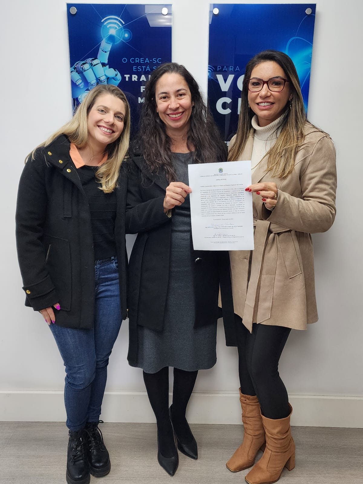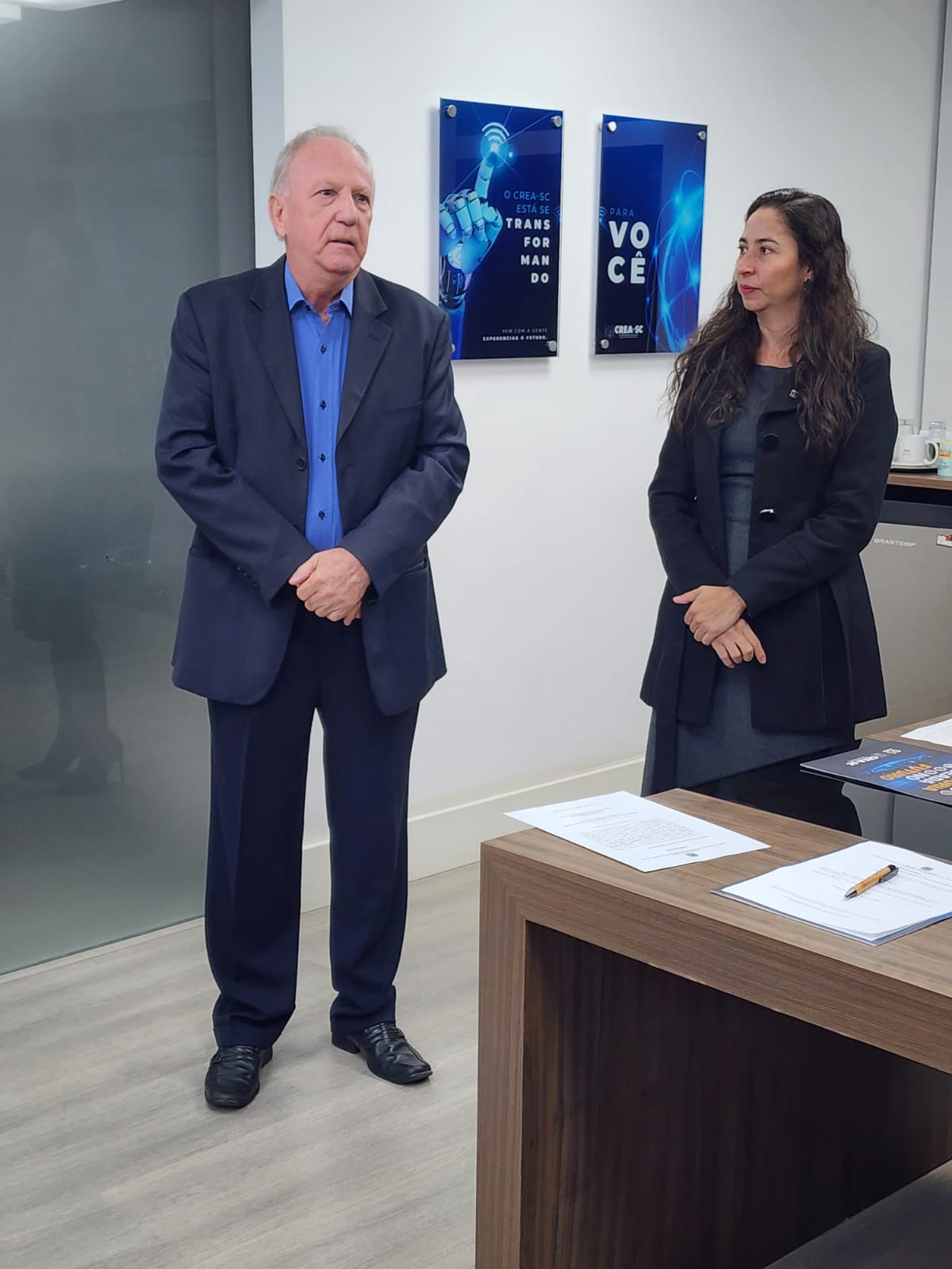 Também tomou posse o novo diretor regional de São Miguel do Oeste, Eng. Civil Olívio José Martini. A assinatura dos termos de posse aconteceu no gabinete da presidente em exercício Eng. Sanit. Amb. e Seg. Trab. Fernanda Maria Felix Vanhoni.