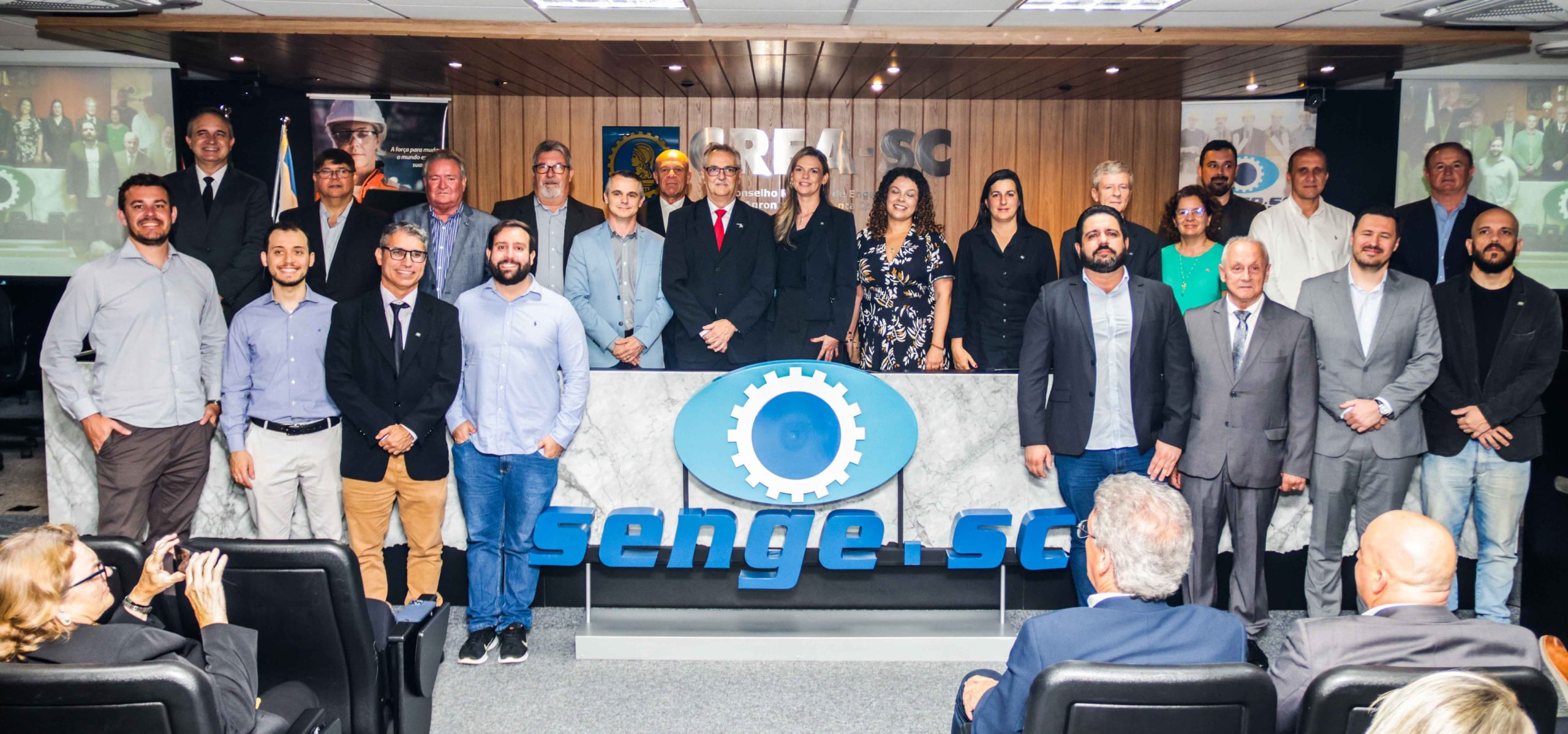 A nova diretoria do Senge-SC tomou posse ontem (24), em solenidade realizada no auditório da sede do Crea-SC, em Florianópolis, que contou com a presença do presidente da Federação Nacional dos Engenheiros (FNE), Murilo Campos Pinheiro, entre muitas autoridades, conferindo imenso prestígio à nova presidente, a engenheira civil e sanitarista Roberta Maas dos Anjos, diretoria e conselheiros. O 2º vice presidente do Crea-SC, eng. Moacyr Rogério Deschamps prestigiou a solenidade.