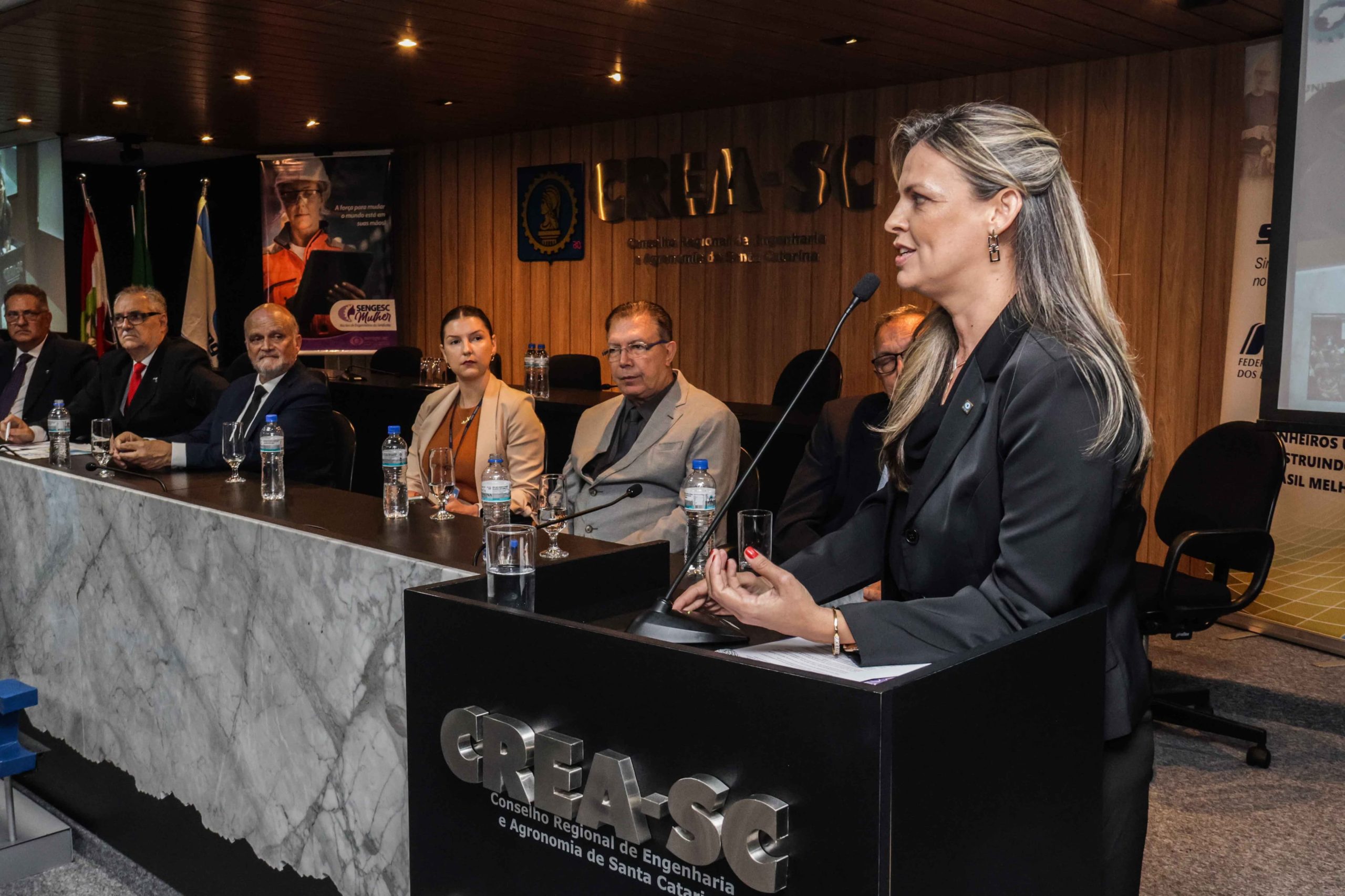 “Hoje não estamos apenas em uma posse, mas em uma renovação de lideranças, e como é essencial essa união para que vozes sejam ouvidas. Contem sempre com o Confea”, Carol Burtet, coordenadora Regional Sul do Confea, representando o Presidente do Confea Vinícius Marchese