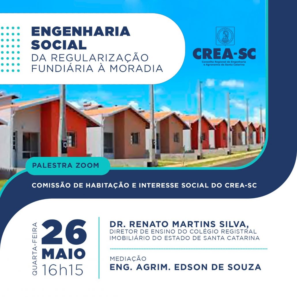 A CHIS – Comissão de Habitação e Interesse Social do CREA-SC realiza nesta quarta-feira, 26.05, às 16h15 a palestra “Engenharia Social – da Regularização Fundiária à Moradia”, ministrada pelo Dr Renato Martins Silva, diretor de Ensino do Colégio Registral Imobiliário do Estado de Santa Catarina, com a mediação pelo Eng. Agrimensor Edson de Souza.