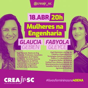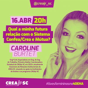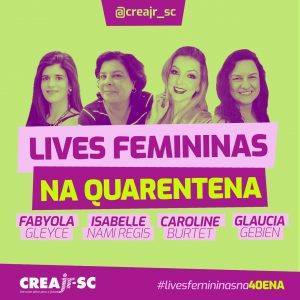Confira a programação das lives no Instagram do @creajr_sc com as engenheiras do Crea-SC, Eng. Civil Caroline Burtet, Eng. Agr. Isabelle Nami Regis, Eng. Ftal. Glaucia Gebien e com a assessora do Confea, Eng. Eletric. e Seg Trab. Fabyola Gleyci da Silva Resende.