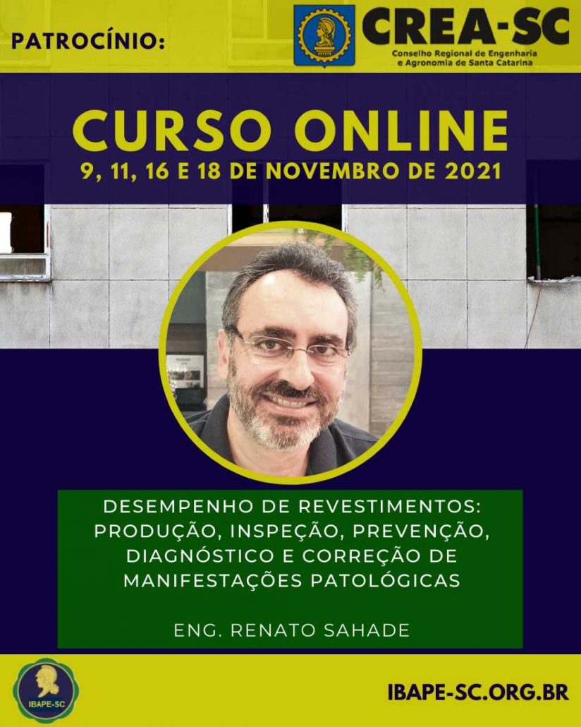 O Instituto Catarinense de Engenharia de Avaliações e Perícias (IBAPE) realiza nos dias 9, 11, 16 e 18 de novembro o curso online de “Desempenho de revestimentos: produção, inspeção, prevenção, diagnóstico e correção de manifestações patológicas”. Serão 14 horas/aula ministradas pelo Eng. Civil Renato Sahade. As inscrições já estão abertas – FAÇA AQUI.
