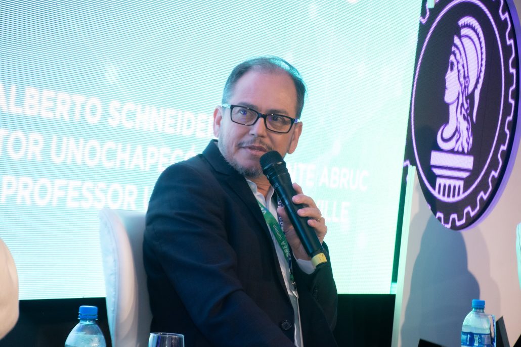 Conduzindo o painel, Claudio Jacoski instigou os demais debatedores a falar sobre os rumos da Engenharia no Brasil. O reitor da Unochapecó contextualizou o cenário atual, com a entrada em vigor do Decreto nº 12.456/2025 e a Portaria MEC nº 381/2025, que estabelecem novas diretrizes para os cursos à distância no ensino superior, sendo que os cursos da área, de acordo com as novas regras, devem ter 40% da carga horária presencial. Também falou sobre o desafio enfrentado pelas universidades ao receber estudantes com preparação precária em matemática, física e química. Jacoski questionou os demais debatedores sobre os rumos da profissão.
