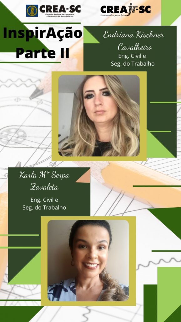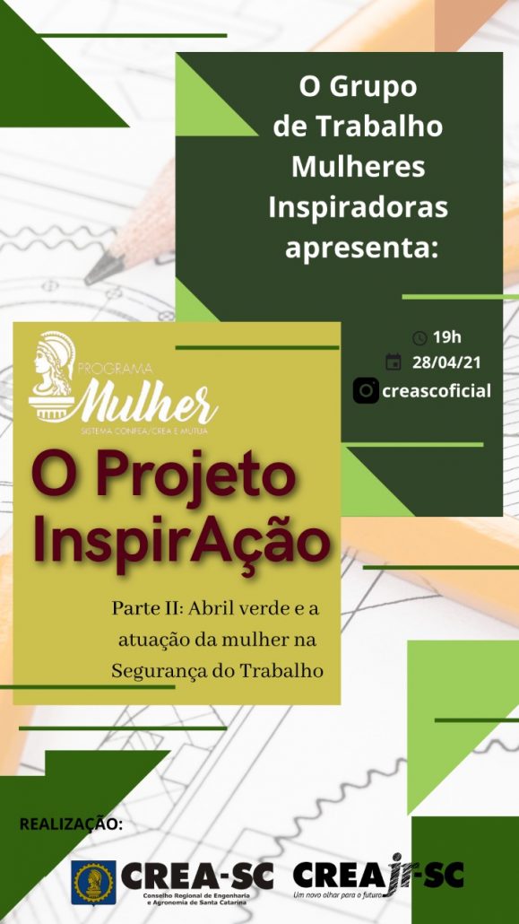 O Crea-SC, por meio do GT Mulheres Inspiradoras, apresentou nesta quarta-feira, às 19h, o Projeto InspiraAção – Parte II, com o tema Abril Verde e a Atuação da Mulher na Segurança do Trabalho. Participação da Eng. Civil e Seg. do Trab. Endriana Kischner Cavalheiro e da conselheira, Eng. Civil e Seg. Trab. Karla Maria Serpa Zavaletta.