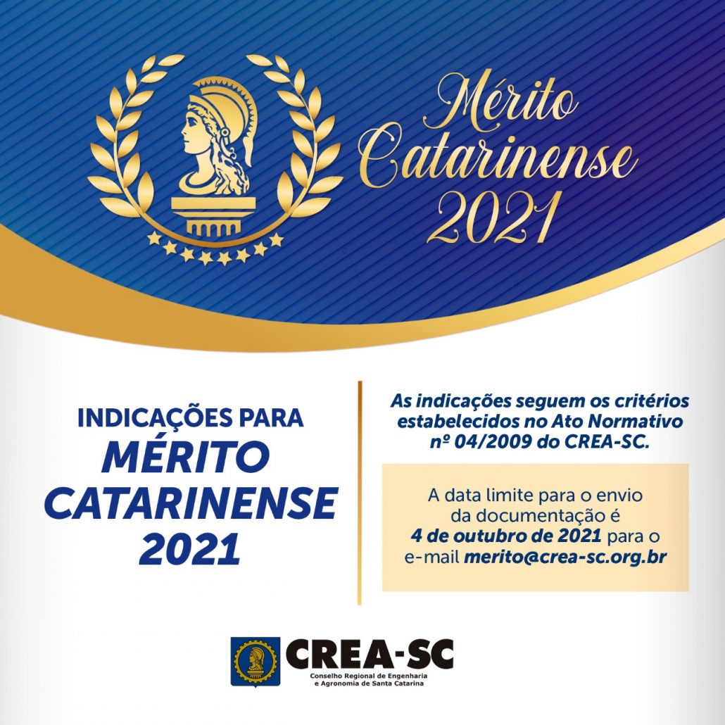 Já estão abertas as indicações para a homenagem de Medalha do Mérito e Inscrição no Livro do Mérito Catarinense, concedida anualmente pelo CREA-SC aos profissionais, empresas, entidades de classe e instituições de ensino que se destacaram na área da Engenharia e Agronomia.