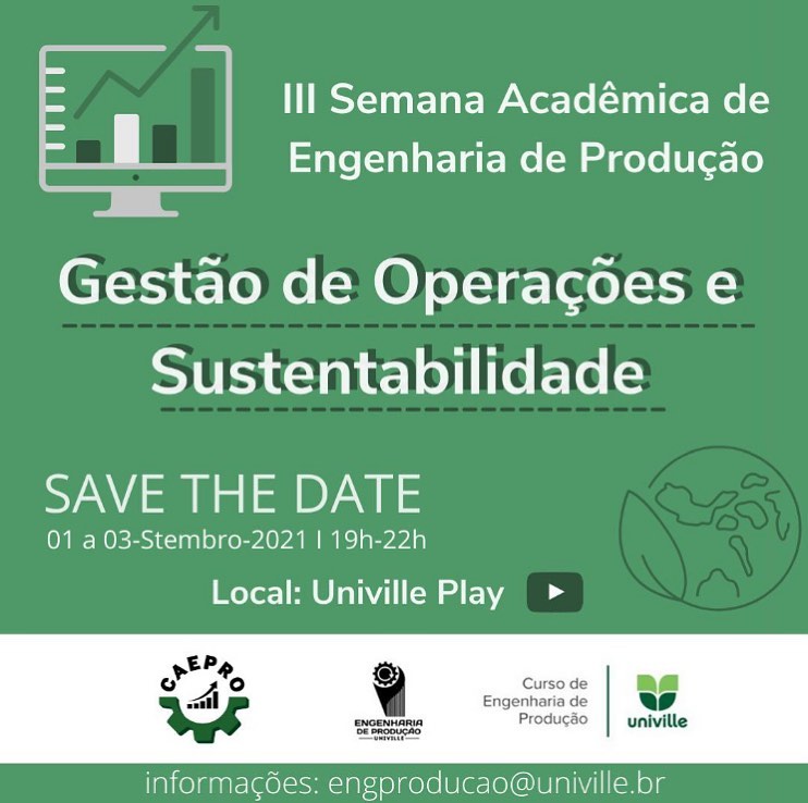 A III Semana Acadêmica de Engenharia de Produção da UNIVILLE é um evento realizado pelo Centro Acadêmico de Engenharia de Produção (CAEPRO) em parceria com a Coordenação do Curso, que visa a integração da academia, indústria e sociedade. O evento acontecerá entre os dias 1º e 3 de setembro de 2021, e terá como tema norteador: “Gestão de Operações e Sustentabilidade“. O objetivo é estimular um debate sobre os desafios tecnológicos que as organizações dos diferentes setores estão vivenciando e a interface da Engenharia de Produção nesse movimento principalmente no que tange à questão ambiental e Sustentabilidade nos processos e negócios das organizações. O encontro recebe apoio da Política de Patrocínio do Crea-SC.
