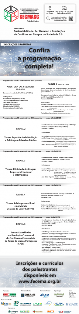 A Federação Catarinense das Entidades de Mediação e Arbitragem (FECEMA) realiza a partir do dia 2 de setembro o X Seminário de Conciliação, Mediação e Arbitragem de Santa Catarina. O tema neste ano será a sustentabilidade, ser humano e resoluções de conflitos em tempos de sociedade 5.0. O evento está com inscrições abertas (FAÇA AQUI) e será totalmente online através da plataforma Zoom.