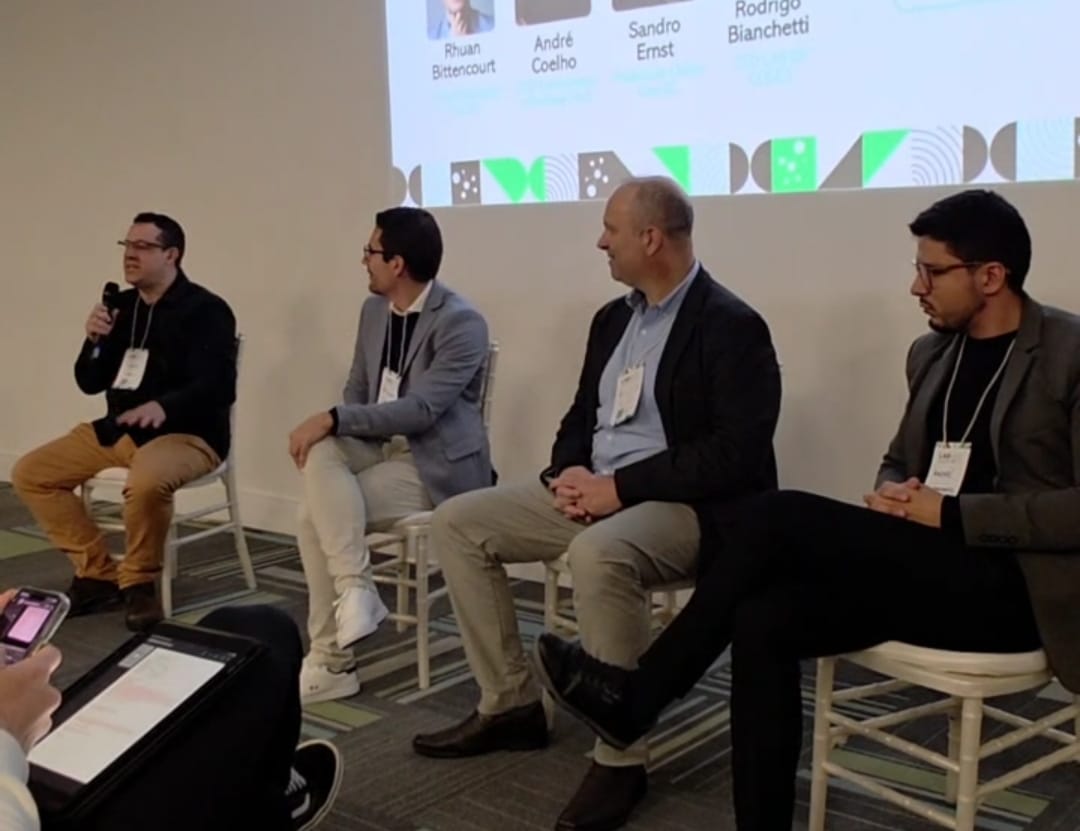 O painel CREA-SC – IA como ferramenta de aceleração da inovação no setor público reúne André Coelho (Autonomoss), Rodrigo Bianchetti (Lab of Codes) e o Eng. Sandro Marcus Ernst, representando o Conselho.
