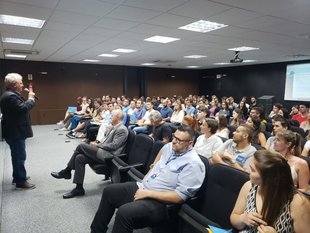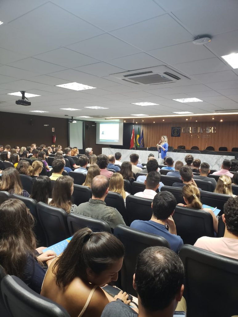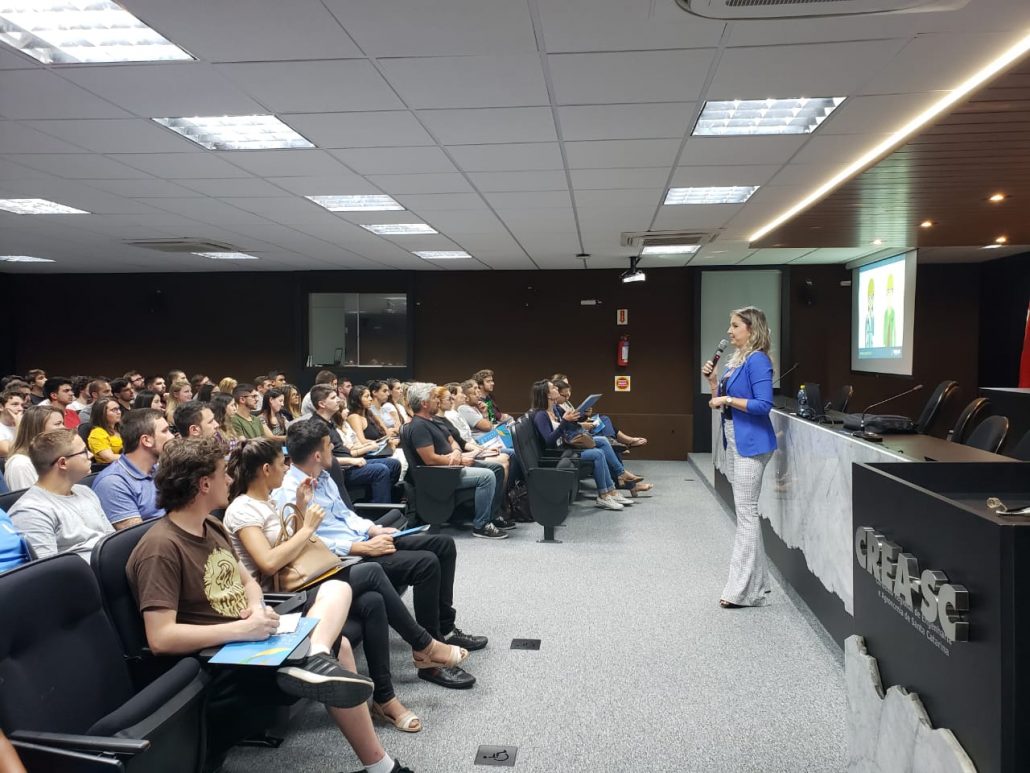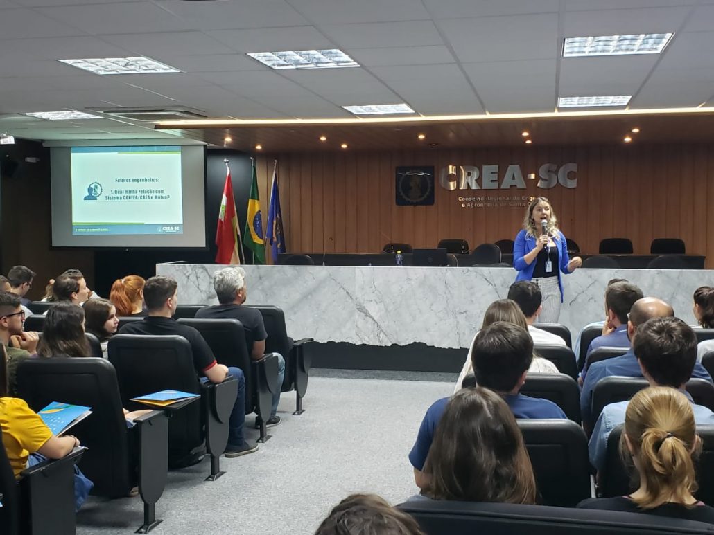 A Assessora de Relações Institucionais do CREA-SC, Eng Civil e de Seg. do Trabalho Caroline Burtet ministrou nessa quinta-feira 16.01 no auditório do Conselho, palestra para mais de cem formandos de instituições de ensino da capital: UNISUL, IFSC, UFSC, ESTÁCIO, UNISOCIESC, IES e UNICESUMAR, dos cursos de engenharias Civil, Elétrica, Sanitária e Ambiental; Produção Mecânica; Produção e Produção Elétrica.