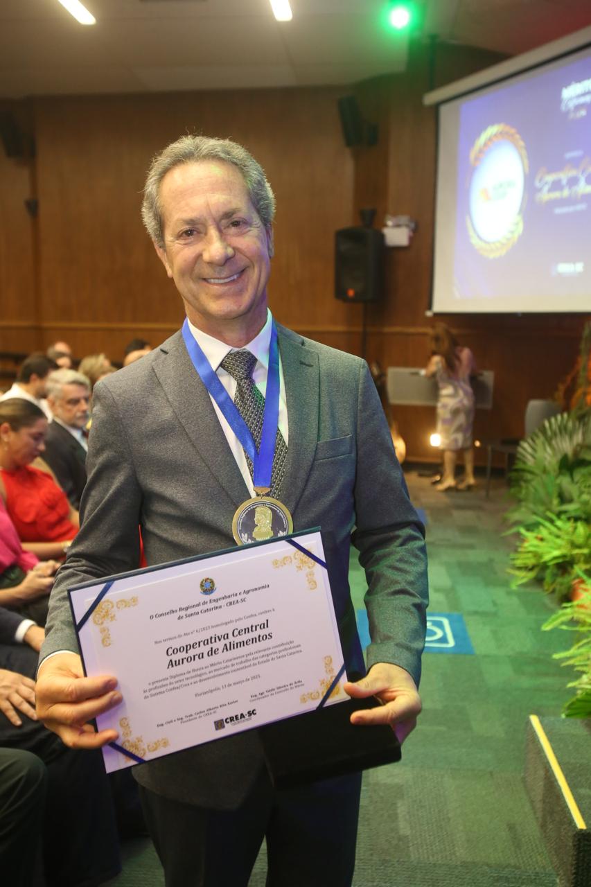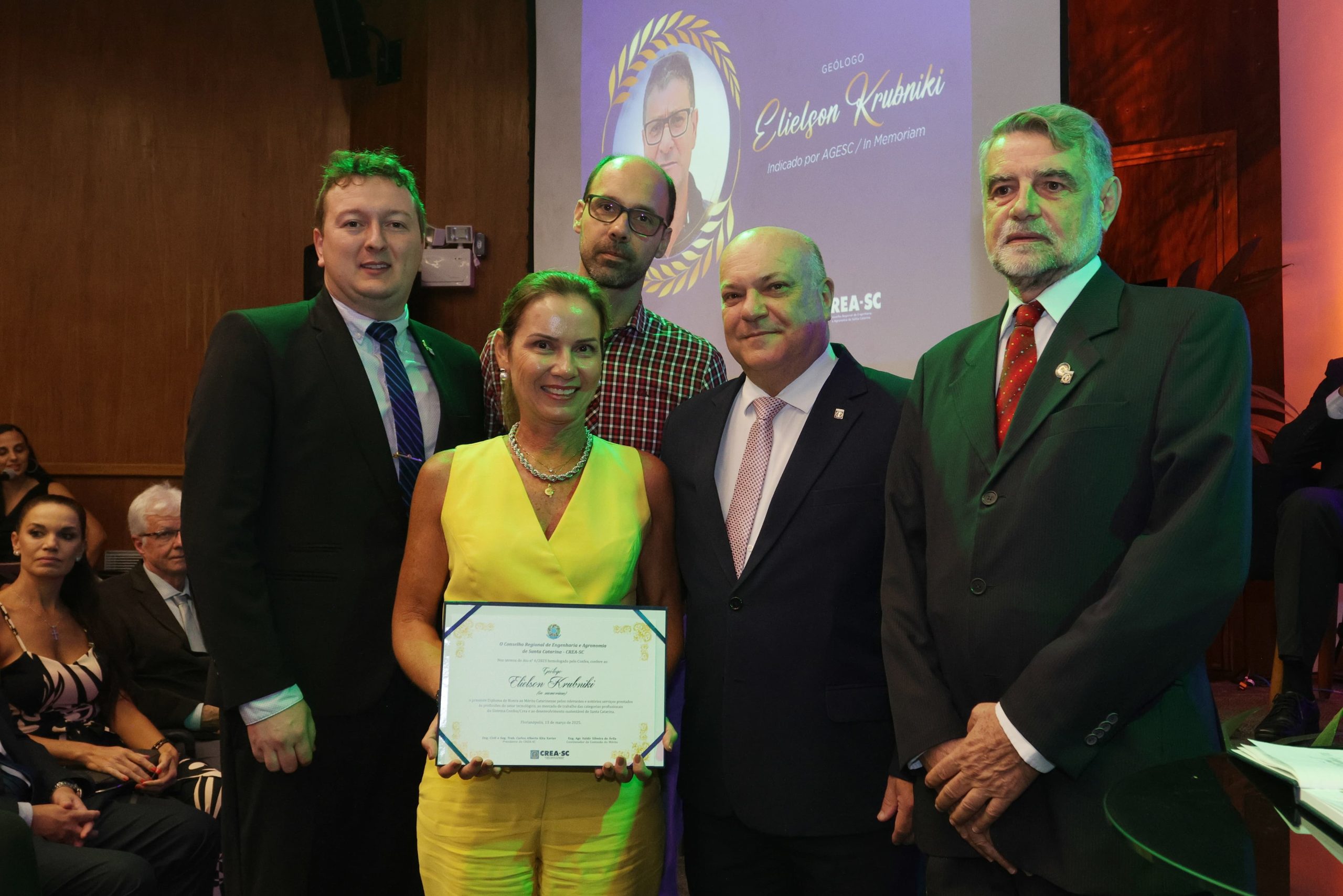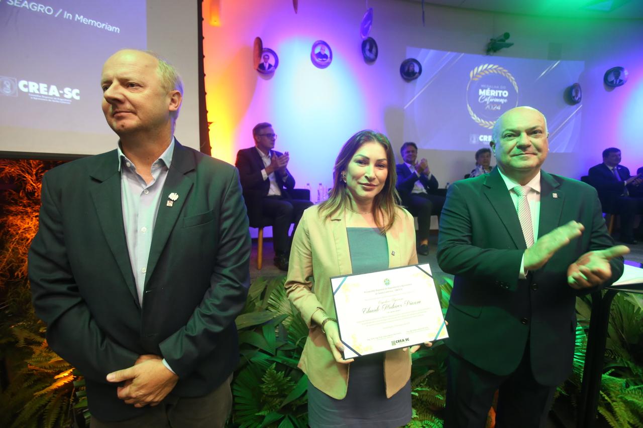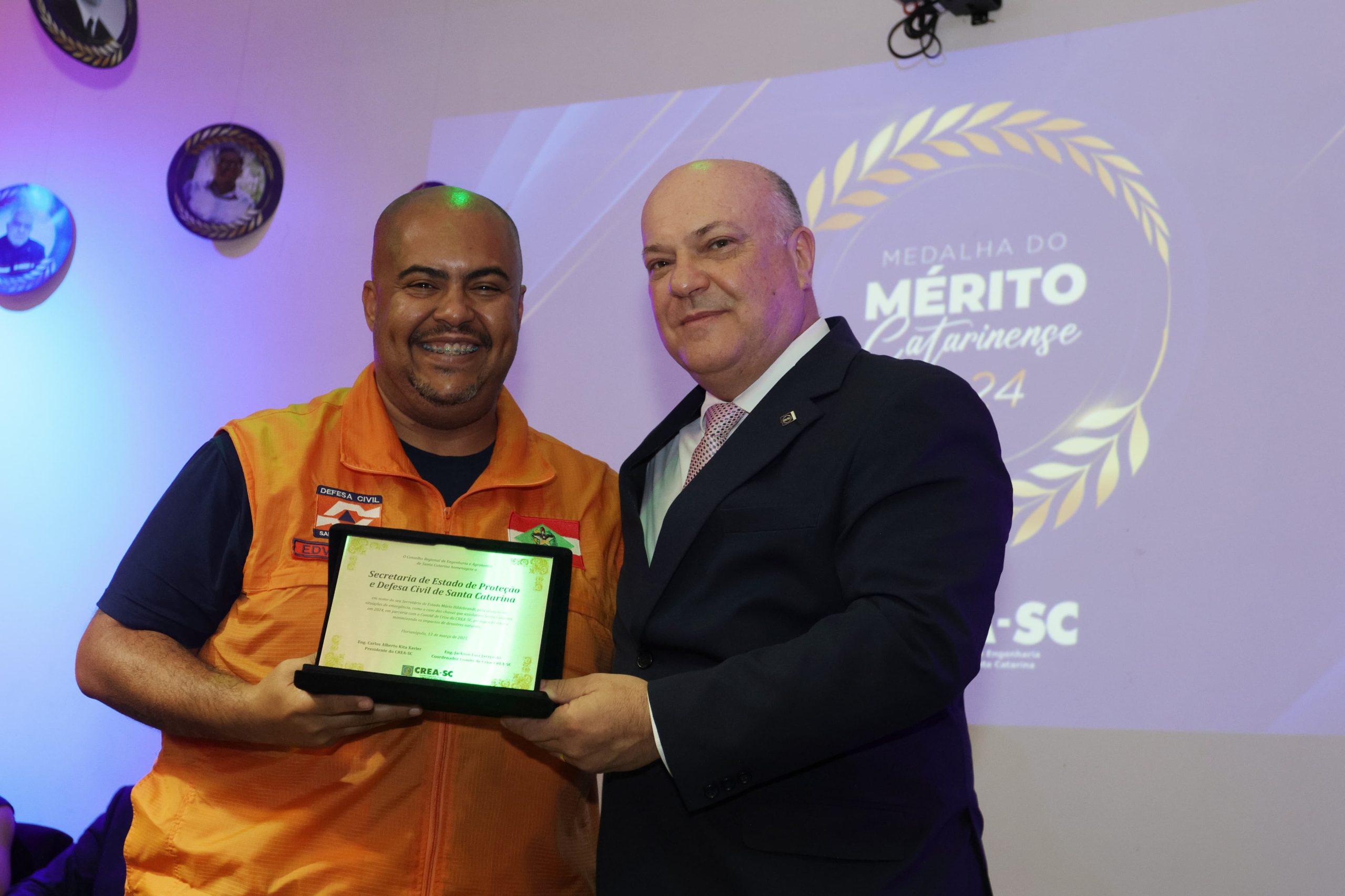 Outra homenagem foi ao secretario de estado de proteção e defesa civil de Santa Catarina, pela atuação nas situações de emergências ocorridas nas chuvas e deslizamentos em Santa Catarina e Rio Grande do Sul, em parceria com o Comitê de Crise do Crea-SC. Receberam medalhas o Eng. Edvaldo dos Santos Junior, representando o secretário Mário Hildebrandt e os membros do Comitê de Crise do Conselho.