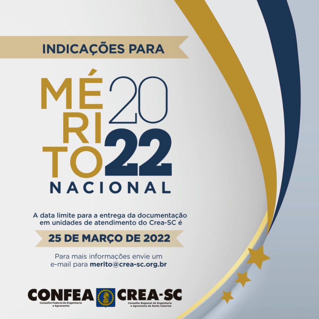 O Conselho Federal de Engenharia e Agronomia – Confea – homenageia anualmente os profissionais e pessoas jurídicas, concedendo a Medalha do Mérito, a Menção Honrosa e a Inscrição no Livro do Mérito do Sistema. Neste ano, as indicações dos homenageados de Santa Catarina para o honraria nacional deverão ser enviadas para a Comissão do Mérito do Crea-SC até 25 de março.