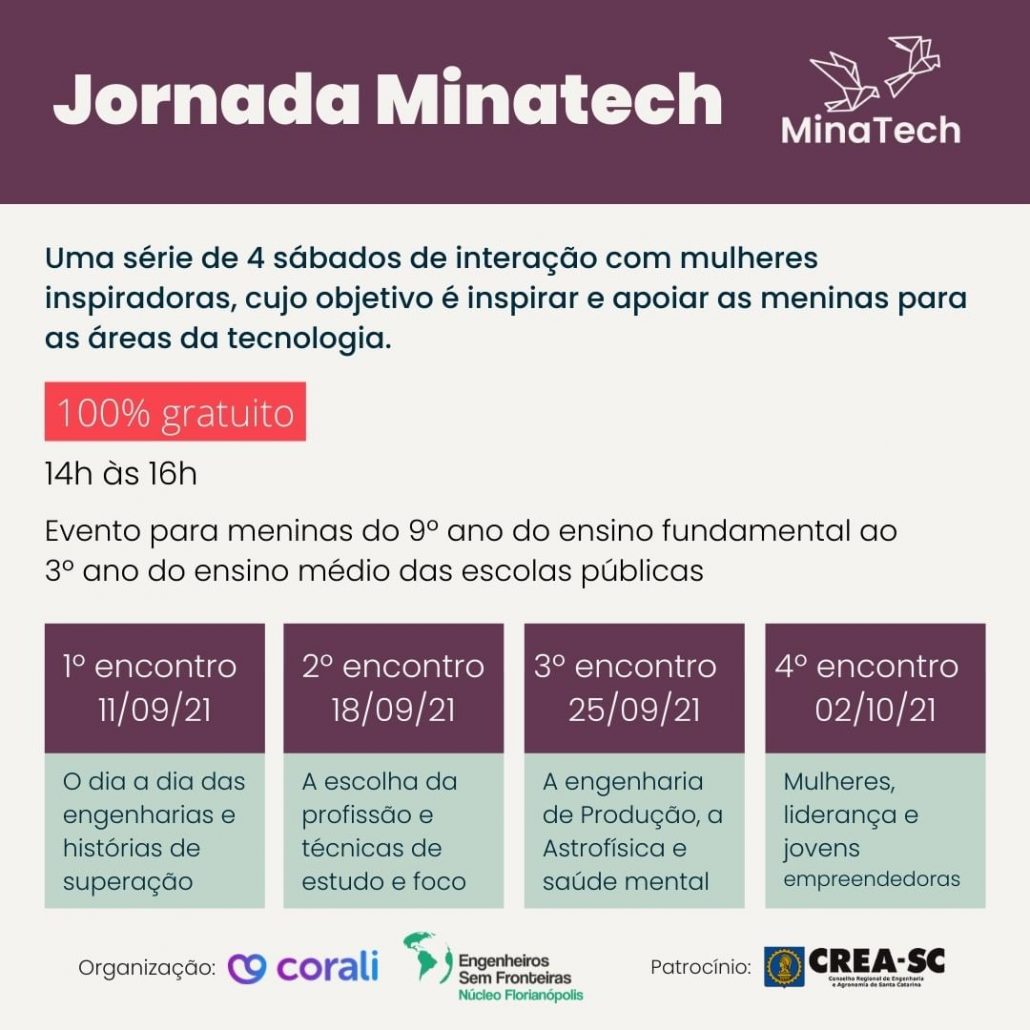 A Jornada faz parte do Programa Minatech, iniciativa da ONG Corali em parceria com o Engenheiros Sem Fronteiras – núcleo Florianópolis e recebe apoio do CREA-SC por meio da Política de Patrocínio.