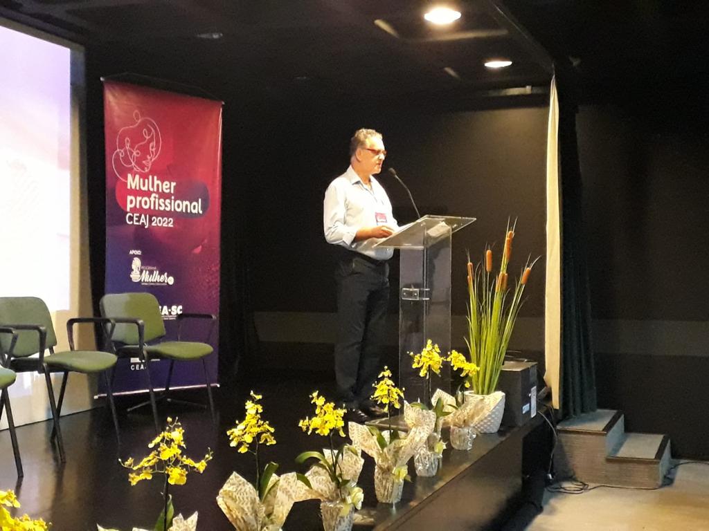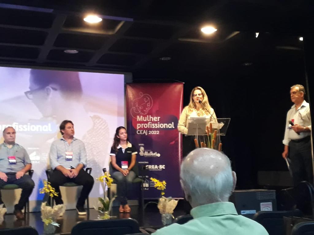 A Eng. Agr. Angela Cristina Paviani, 1ª vice-presidente do CREA-SC, representa o presidente Eng. Civil e Seg. Trab. Carlos Alberto Kita Xavier, no evento Mulher Profissional CEAJ 2022, promovido pelo Centro de Engenheiros e Arquitetos de Joinville, nesta terça feira, 29 de março das 8h às 18h30. O evento tem transmissão ao vivo e apresenta palestras com relatos de sucesso da participação feminina nas áreas da engenharia, agronomia e geociências e no meio empresarial. Presenças do 2º Vice-presidente do CREA-SC, Eng. Mec. Osny do Amaral Filho, do diretor regional de Joinville, Eng. Civil e Seg. Trab. Daniel Kandler Signori, e conselheiro Eng. Mec. Alfredo Herbst Neto.