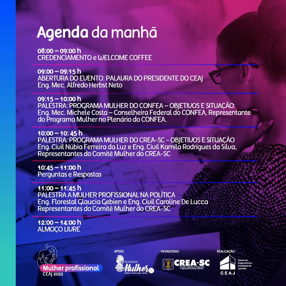 A Carreira da Jovem Mulher Profissional; Mulher Profissional na Política; De Engenheira a Diretora de grande Empresa são temas em debate. A programação inclui também a apresentação das ações desenvolvidas pelo GT Mulher do CREA-SC e também do Confea.