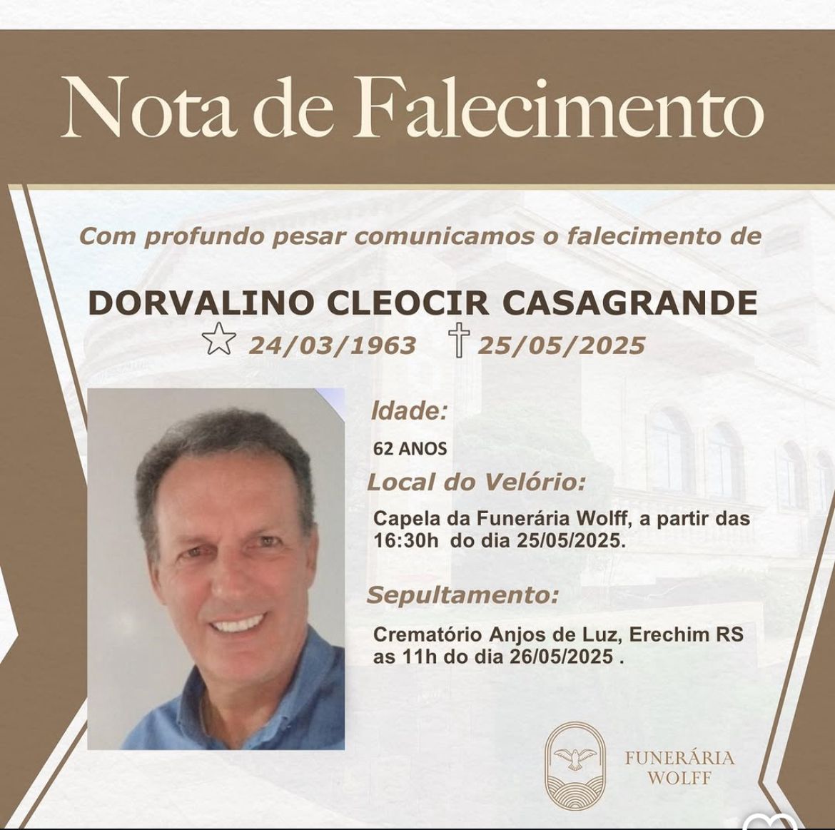 O velório ocorreu na Capela da Funerária Wolf, desde as 16h30 do dia 25 de maio de 2025 e o sepultamento está sendo realizado hoje (26), no Crematório Anjos de Luz, em Erechim, RS.