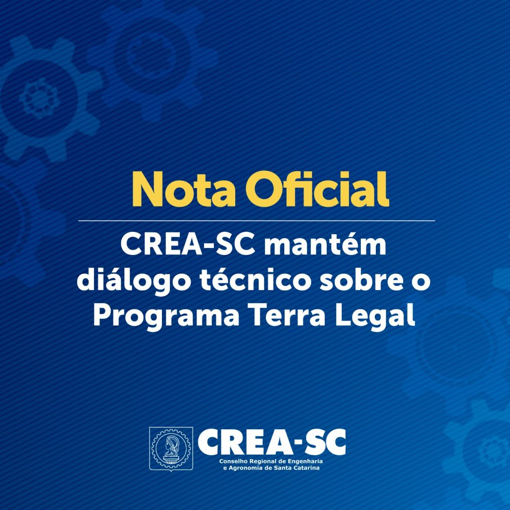 O Conselho Regional de Engenharia e Agronomia de Santa Catarina (CREA-SC) vem a público esclarecer informações veiculadas pela imprensa sobre o Programa Terra Legal, do Governo do Estado, executado pela Secretaria de Estado da Agricultura e Pecuária.