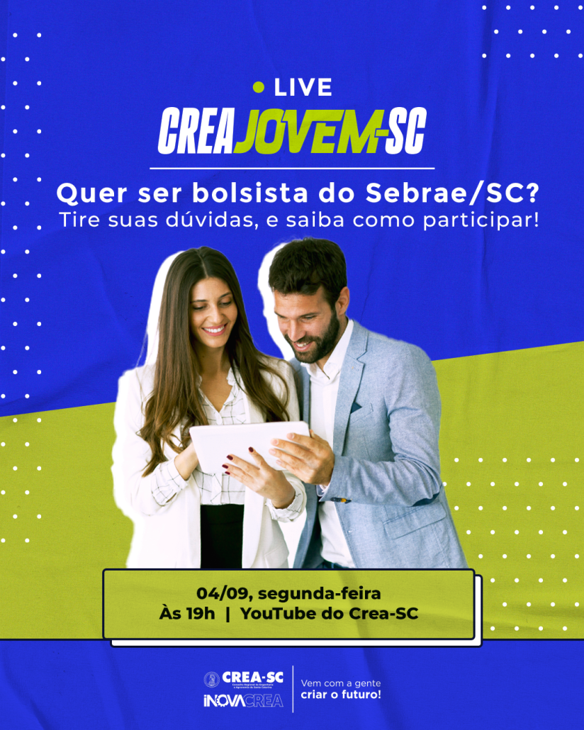 O Programa CREA Jovem-SC, em parceria com o SEBRAE/SC convida você para participar da live no dia 04/09 às 19h com transmissão no canal do YT do CREA-SC e tirar suas dúvidas para participar da seleção de BOLSISTAS para atuarem o como Agentes Locais de Inovação.