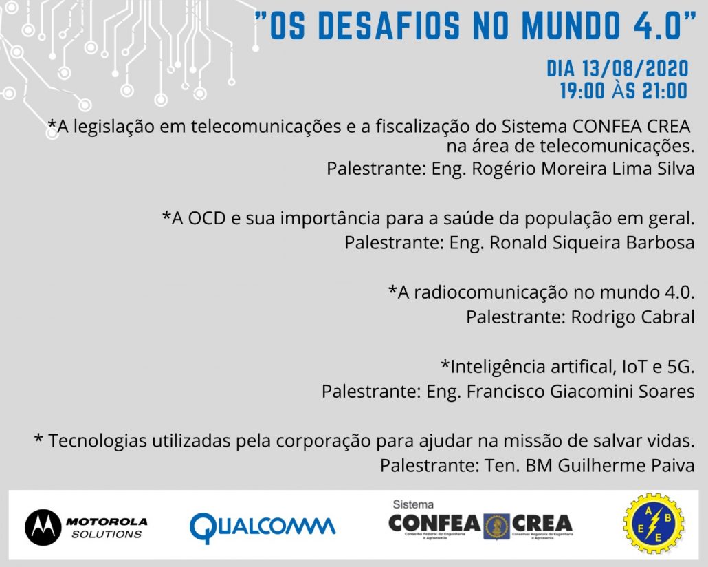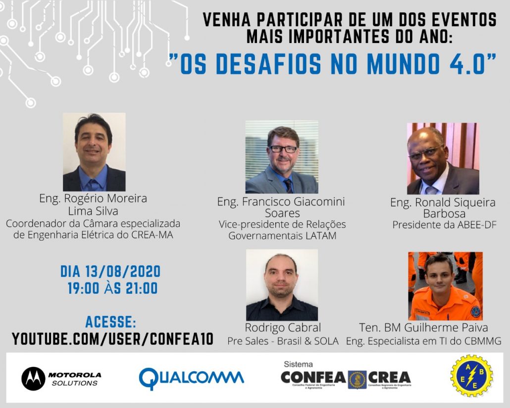 A Associação Brasileira de Engenheiros Eletricistas promove no dia 13.08 o evento “Os desafios no mundo 4.0”. Com o apoio do sistema Confea/Crea, e das empresas Qualcomm e Motorola, o webinar será transmitido das 19 às 21 horas ao vivo no pelo canal do Confea.