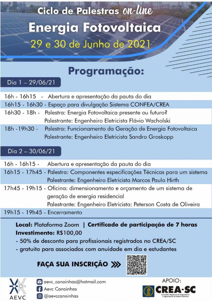 A Associação dos Engenheiros e Arquitetos do Vale do Canoinhas (AEVC) realiza nos dia 29 e 30 de junho um ciclo de palestras on-line sobre Energia Fotovoltaica. As inscrições já estão abertas, garanta sua vaga acessando o LINK AQUI. O evento é gratuito para associados da AEVC e estudantes e oferece desconto de 50% para profissionais registrados no Crea-SC. O investimento é de R$100.
