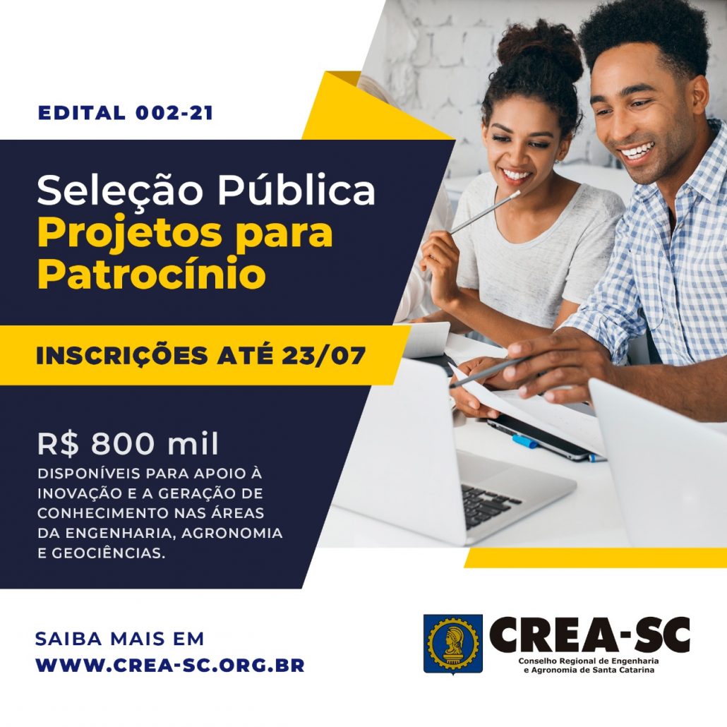 Com objetivo de contribuir para o fortalecimento e a valorização das profissões da área tecnológica, bem como promover a interação entre profissionais, empresas e instituições científicas, o CREA-SC lança o Edital – Seleção Pública 002-2021, da Política de Concessão de Patrocínio.