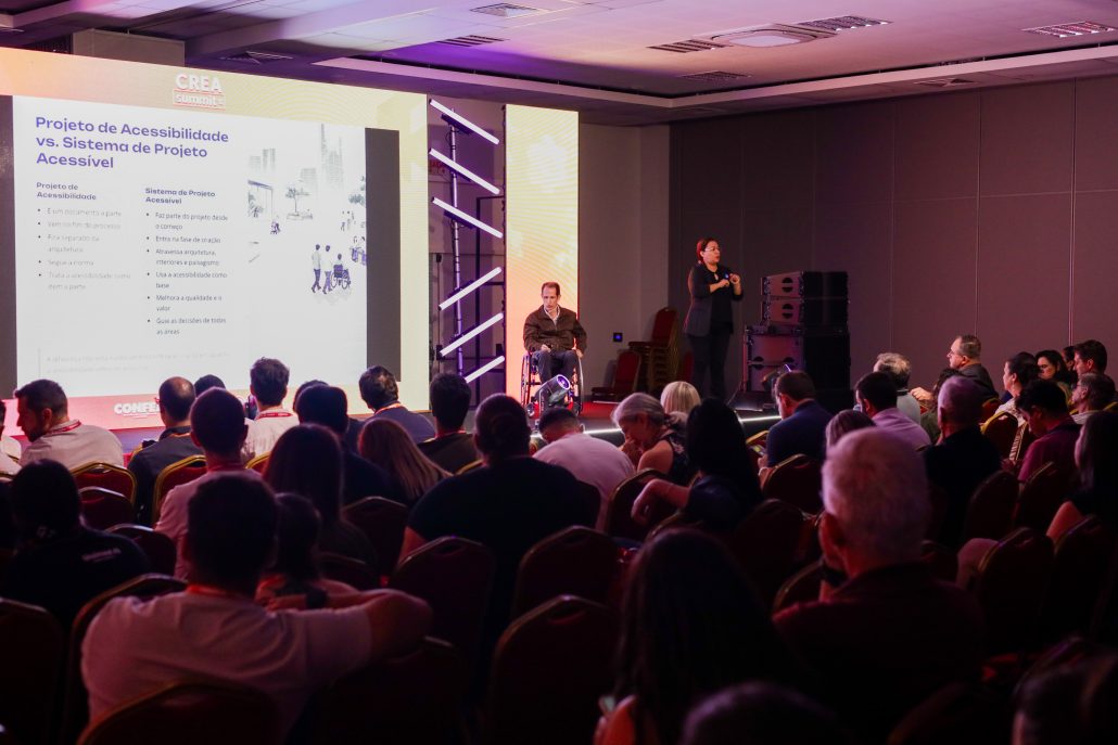 Outro destaque da sua fala foi sobre os erros mais comuns em obras, sendo elas: tratar a acessibilidade como etapa final; copiar soluções padrão sem considerar o contexto real do projeto; e focar apenas no sanitário acessível e em rampas.