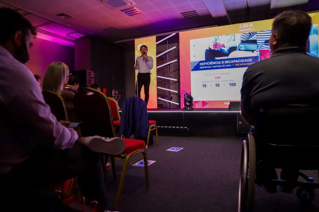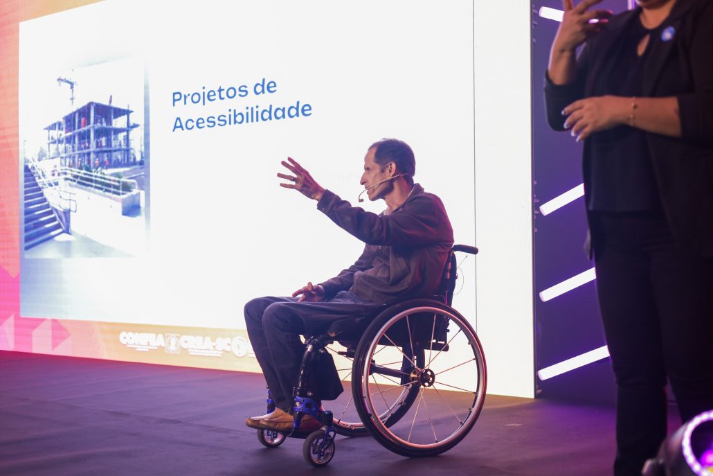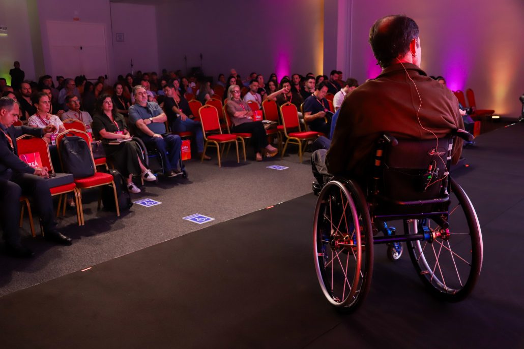 Durante a apresentação, Bara destacou que a inclusão vai além das adaptações técnicas e arquitetônicas, passando principalmente por uma mudança de atitude. “A acessibilidade física é fundamental, mas a verdadeira transformação acontece quando saímos da posição de espectadores e assumimos nosso papel ativo”, afirmou. O palestrante fez um convite ao público para deixar a posição na arquibancada e entrar em campo para participar efetivamente da construção de ambientes mais inclusivos.