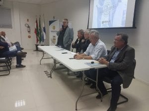 Entre as autoridades da mesa, o presidente do CREA-SC, Eng. Agr. Ari Geraldo Neumann; o Eng. Civil Nelson Nitz, presidente do Sinduscon, o diretor regional de Itajaí, Geog. José Gabriel Heerdt; o coordenador do 13º CEP, Eng. Mec. Wilson Cesar Floriani; o diretor geral da Mútua-SC, Eng. Civil Abelardo Pereira Filho; e o coordenador do CDER, Eng. Agrim. Valdir Schneider. Presença também do ex-presidente do CREA-SC, Eng. Civil e Seg. Trab. Carlos Alberto Kita Xavier.