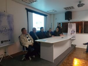 Entre as autoridades, o presidente do CREA-SC, Eng. Agr. Ari Geraldo Neumann; o coordenador do CDR, Eng. Agr, Alvaro Dourado; o coordenador do 13º CEP, Eng. Mec. Wilson Cesar Floriani; o coordenador do CDER, Eng. Agrim. Valdir Schneider; o diretor geral da Mútua-SC, Eng. Civil Abelardo Pereira Filho; o superintendente da Mútua Caixa de Assistência dos Profissionais, Eduardo Zeidmann; o diretor regional de Videira, Eng. Agr. e Ambiental Fabricio Denardi; os conselheiros Eng. Agr. Angela Paviani e Eng. Ambiental Thiago Borga; o vice-presidente da Associação dos Engenheiros e Arquitetos de Caçador (ADEAC), Eng. Ambiental Nilso Barros; o diretor da Associação dos Engenheiros Agrônomos da Região de Caçador (AEAC), Eng. Agr. Leandro Hahn; a presidente da Associação Regional dos Engenheiros e dos Arquitetos de Videira (AREAVID), Eng. Agr. Carla Hasegawa; e o presidente da Associação dos Engenheiros e Agrônomos de Fraiburgo (ASSEAF), Eng. Civil Ilgo Regalin Júnior.