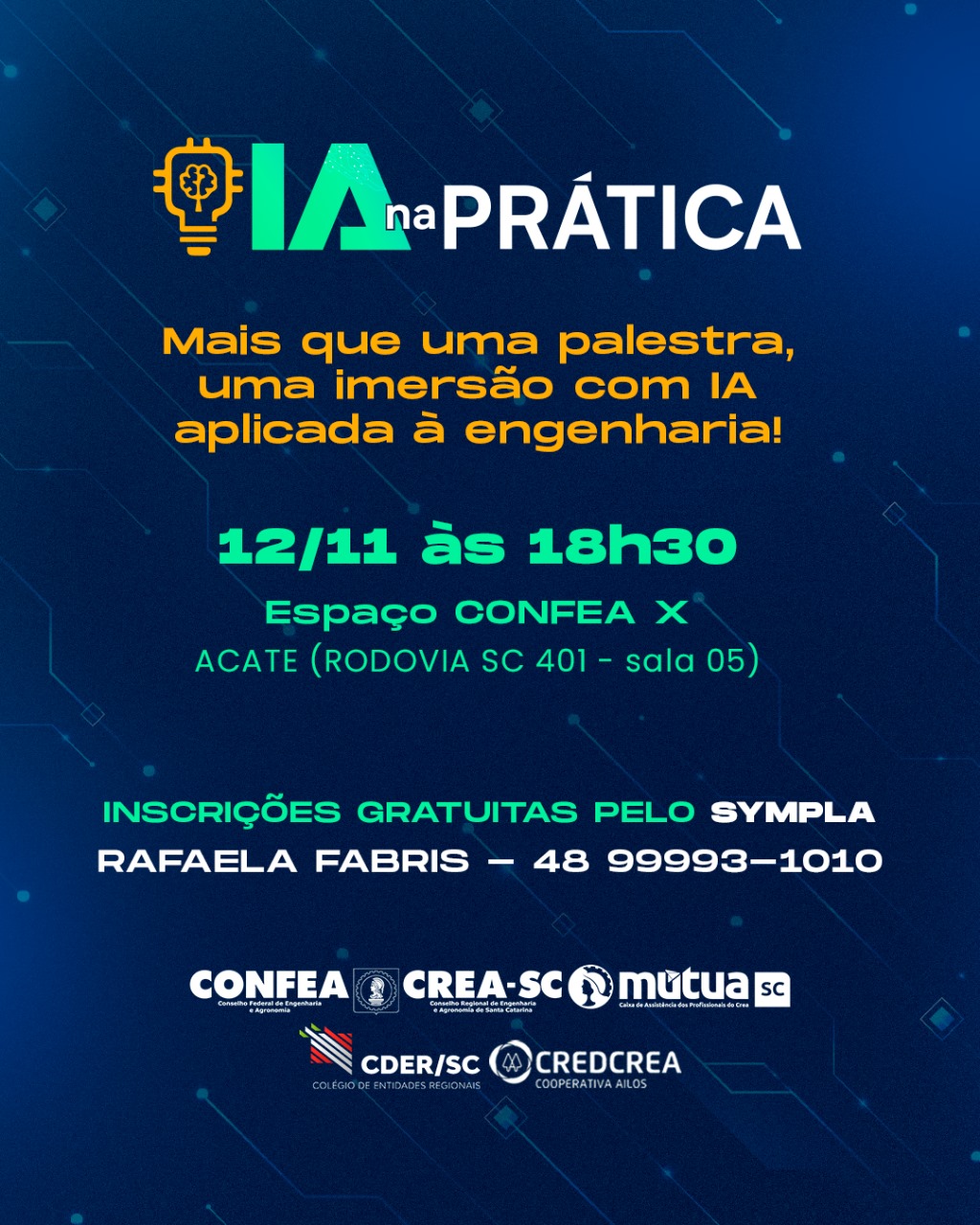 O avanço da Inteligência Artificial (IA) está transformando a forma de pensar, projetar e executar na engenharia. Com o objetivo de apresentar aplicações reais e acessíveis dessa tecnologia no dia a dia dos profissionais, o evento “IA na Prática – Uma imersão com IA aplicada à engenharia” será realizado no dia 12 de novembro de 2025, das 18h30 às 20h30, no Espaço Confea X, na ACATE, em Florianópolis (SC).