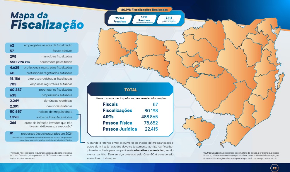 Expansão da fiscalização – Com 57 fiscais atuando em todos os 295 municípios catarinenses, o CREA-SC realizou 80.198 relatórios de fiscalização, com foco na orientação e educação dos profissionais. Como resultado, apenas 1.398 autos de infração foram emitidos, reforçando a eficácia do trabalho orientativo e preventivo. O ano também registrou 2.831 novos registros de profissionais e 3.243 novas empresas, totalizando 78.652 profissionais e 22.415 empresas ativas.