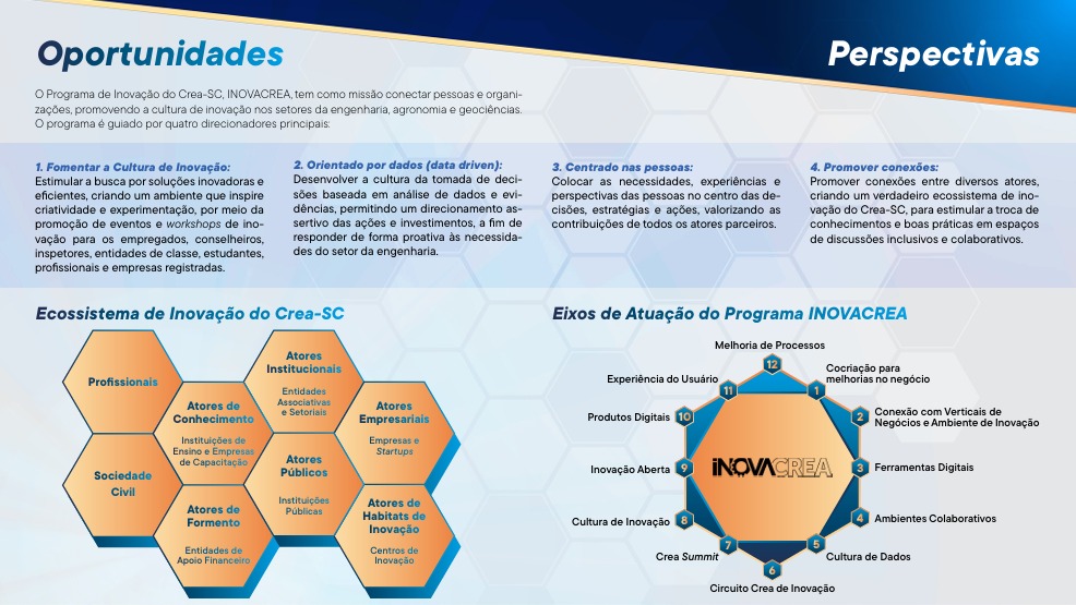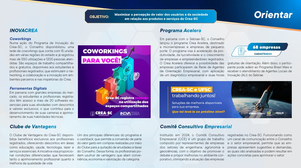 Suporte e incentivo à capacitação – Entre as ações voltadas ao desenvolvimento profissional, o CREA-SC impulsionou programas como o CREA Acelera, voltado para micro e pequenas empresas, o CREA Jr, que aproxima o Conselho dos estudantes e incentiva a formação de novas lideranças, e o CREA Jovem, que apoia recém-formados com capacitação e suporte. Além disso, o CREA Summit 2024 reuniu cerca de 2.000 participantes para discutir temas como tecnologias disruptivas e cidades inteligentes.