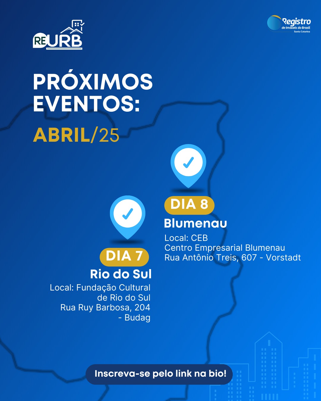 A Caravana Reurb, maior ação do estado para promover a regularização fundiária urbana vai percorrer o Vale do Itajaí nos dias 7 e 8de abril. Os eventos acontecem nas cidades de Rio do Sul, Fundação Cultural e Blumenau, Centro Empresarial, respectivamente.