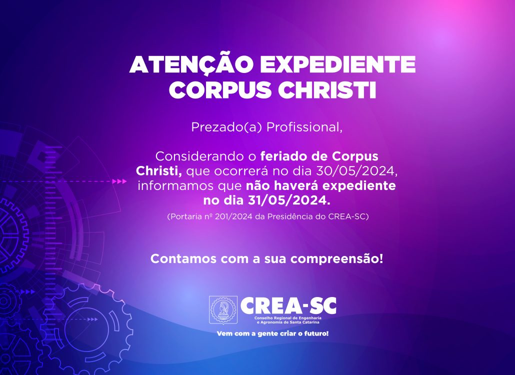 Informamos aos profissionais que na sexta-feira dia 31 de maio não haverá expediente nas unidades de atendimento no estado e sede do Crea-SC.