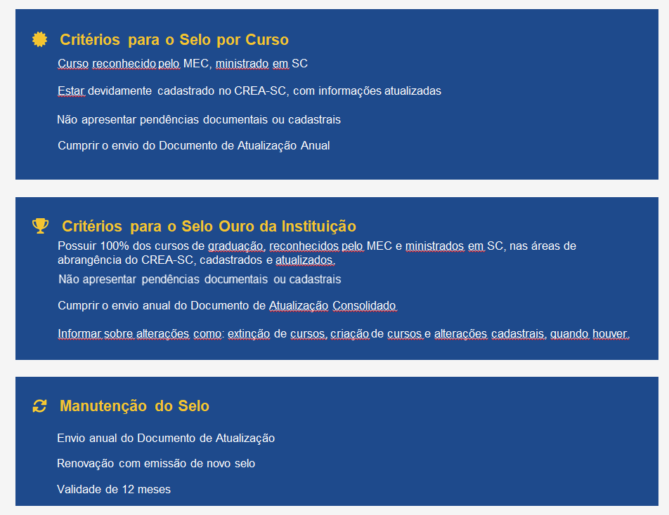 O programa tem como objetivo reconhecer a regularidade do cadastro dos cursos de graduação e pós-graduação lato sensu e stricto sensu afetos ao Sistema Confea/Crea ofertados em Santa Catarina. O Selo não avaliará a qualidade pedagógica dos cursos, mas sim a conformidade com as exigências legais, com base na Resolução nº 1.073/2016 do Confea.