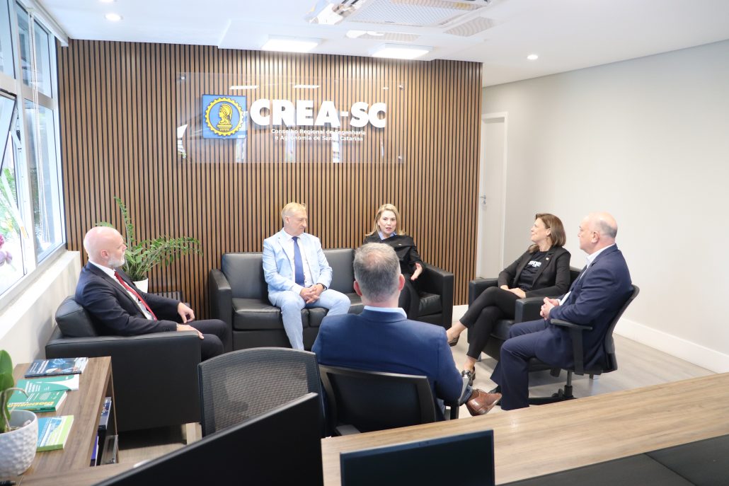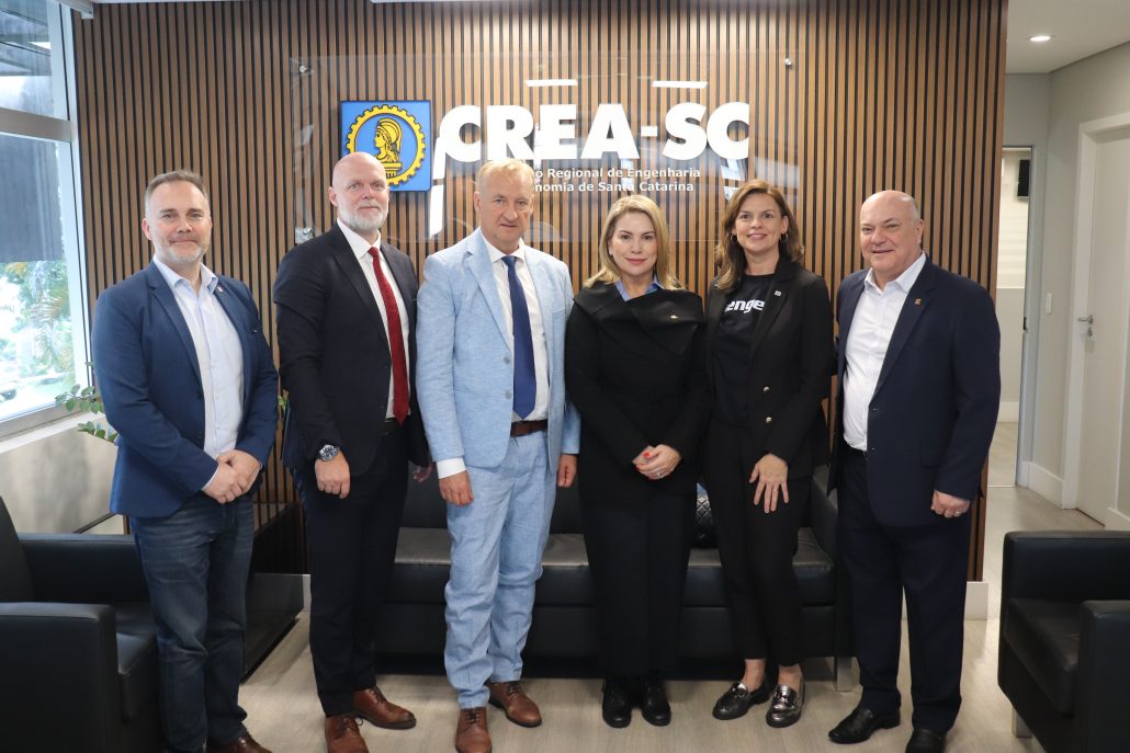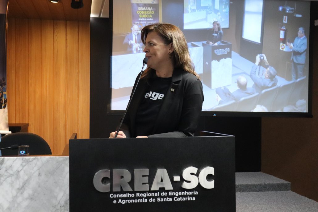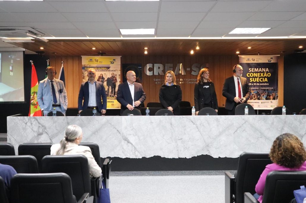 Realizada na sede do CREA-SC, a programação contou com a presença do presidente do Conselho, Eng. Kita Xavier, da presidente do Senge-SC, Eng. Roberta Mass dos Anjos, do idealizador do projeto, Eduardo Bridi, da cônsul da Suécia, Isabela França, e dos professores suecos Roy Anderson e Kent Salomosson.