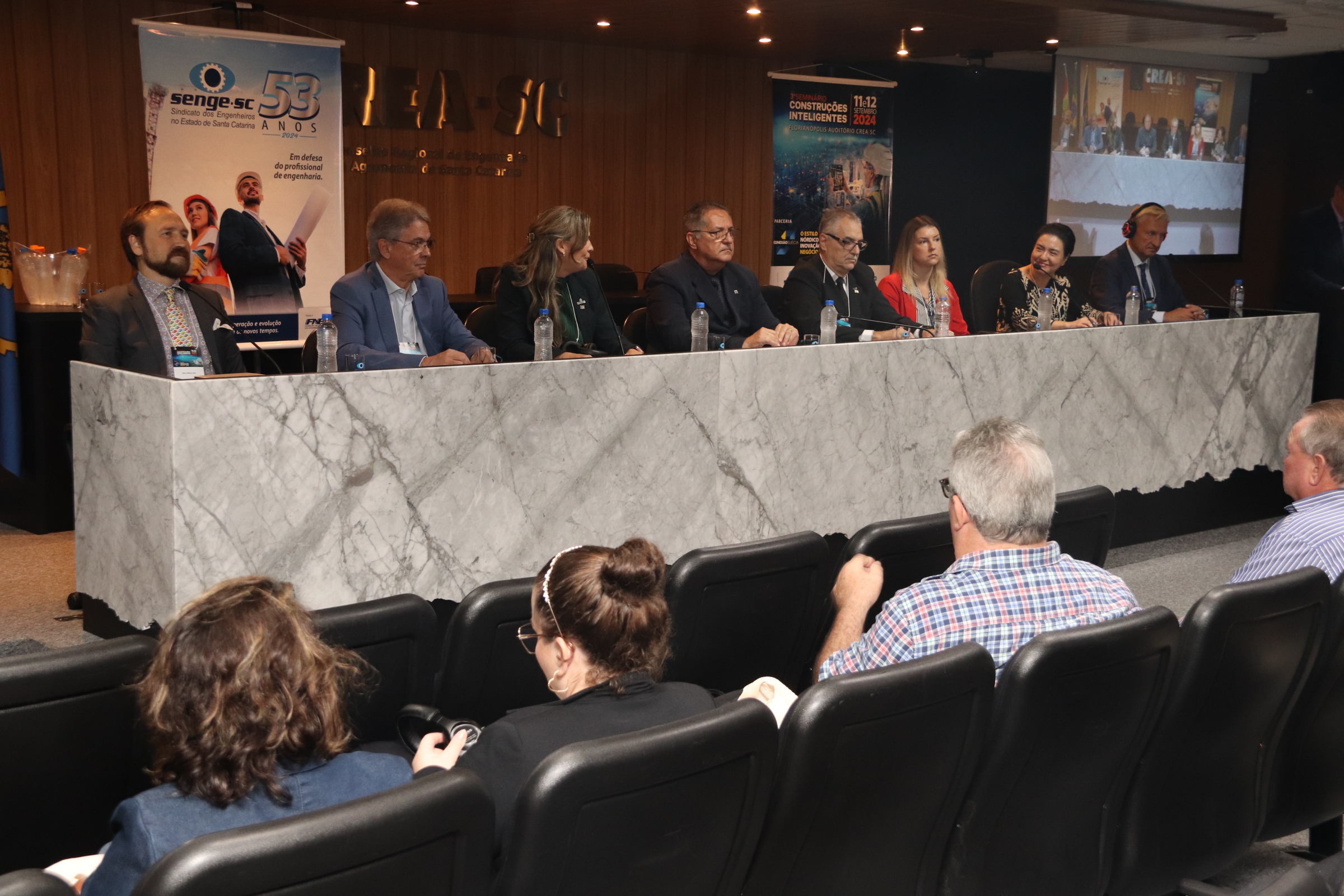Entre as autoridades da mesa de abertura estavam: o presidente do Sindicato dos Engenheiros do Estado de Santa Catarina (SENGE) e diretor financeiro da Federação Nacional dos Engenheiros (FNE), Eng. Carlos Bastos Abraham; o presidente em exercício do CREA-SC, Eng. Moacir Rogério Deschamps Júnior; a coordenadora regional Sul do Confea, Eng. Caroline Bourtet; a diretora financeira da Mútua, Eng. Roberta Maas dos Anjos; o consultor e professor da West University da Suécia, Eng. Roy Eric Ragnar Andersson; o CEO da Vision House, empresa de TI da Tailândia, professor da Universidade de Boras da Suécia e do Asian Institute of Technology da Tailândia, Klas Hakan Alm; e o presidente da CELESC, Eng. Tarciso Rosa.