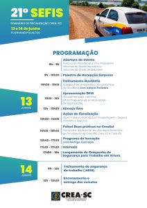 O 21º SEFIS – Seminário Estadual de Fiscalização do CREA-SC acontece nos dias 13 e 14 de junho na sede do Conselho, em Florianópolis, e reúne agentes fiscais de todo o estado. O objetivo é reunir os profissionais para a atualização de normas, procedimentos e referências legais, esclarecendo dúvidas e introduzindo as novas rotinas e tecnologias nas atividades de campo. Este ano, um dos pontos mais importantes será o lançamento da Campanha de Segurança para Trabalho em Altura, um material orientativo que complementará as atividades da fiscalização.