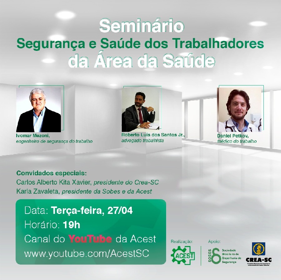 A Associação Catarinense de Engenharia de Segurança do Trabalho (Acest) promove nesta terça-feira, dia 27, véspera da data mundial e nacional dedicada à memória das vítimas de acidentes e doenças do trabalho, o seminário Segurança e Saúde dos Trabalhadores da Área da Saúde. O evento ocorrerá das 19h às 21h e será transmitido ao vivo pelo canal do YouTube da Acest As inscrições são gratuitas e, para garantir certificado de participação, devem ser feitas aqui.