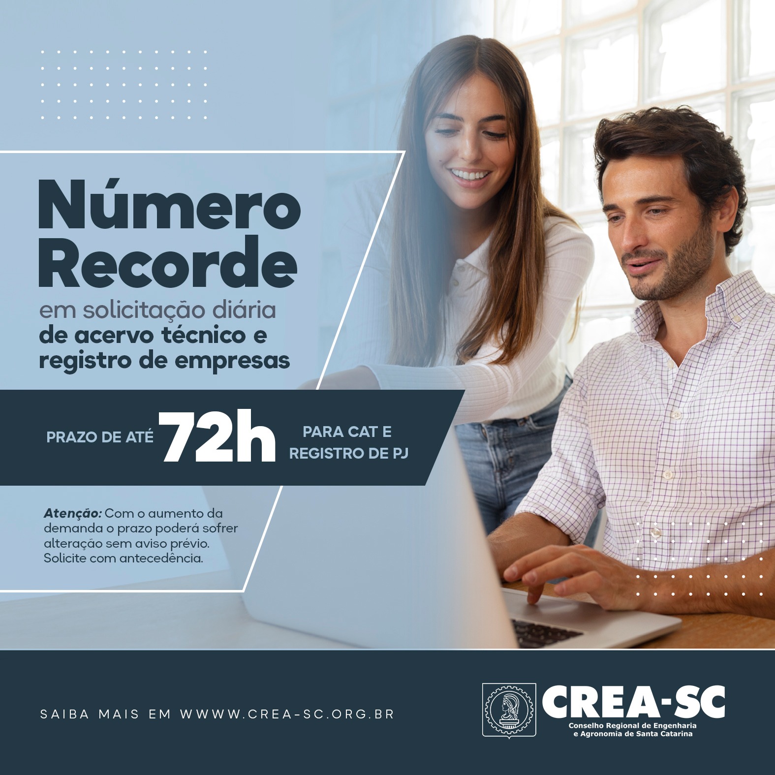 Para atender aos profissionais e empresas que estão solicitando CAT, RAT e registros/atualizações de empresa, devido ao edital da Caixa Econômica Federal para a prestação de serviços técnicos de avaliações de imóveis – cadastramento até 26.04, o Departamento Técnico do Crea-SC está realizando um força tarefa visando manter o prazo de resposta.