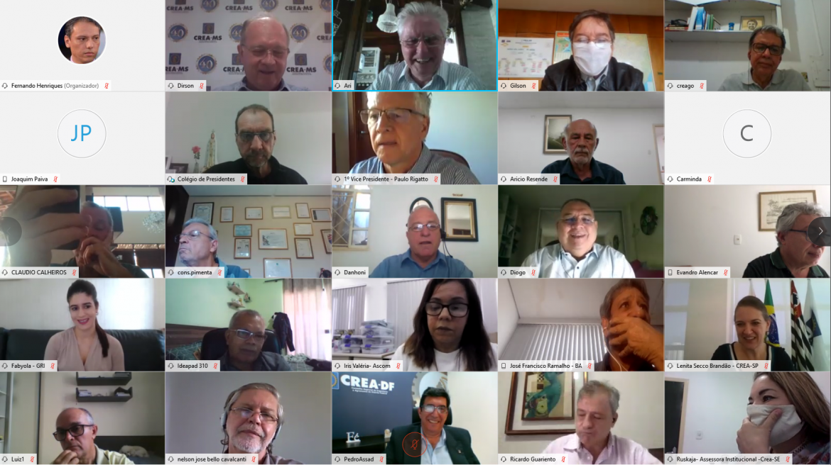 Reunido virtualmente em terceira reunião ordinária do ano, o Colégio de Presidentes aprovou, nesta manhã, proposta de alteração de condicionantes do Programa de Auxílio Financeiro do Sistema Confea/Crea de Enfrentamento ao Coronavírus SARS-CoV-2 (Covid-19) e de edição de resolução que regulamente o Programa de Recuperação de Créditos (Refis) para 2021. Ambas as propostas são de autoria do presidente do Crea-MS, eng. agr. Dirson Freitag, e foram aprovadas por unanimidade. A reunião foi encerrada ainda pela manhã. O colegiado que reúne todos os presidentes dos Creas volta a se reunir em 9 de setembro.