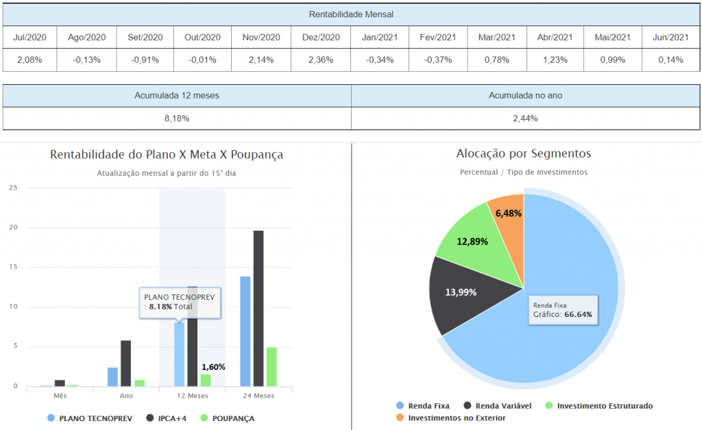 O TecnoPrev teve desempenho positivo pelo quarto mês consecutivo, em junho deste ano – com rendimento de 0,14% – e em consonância com os dados econômicos do cenário doméstico. O plano de previdência complementar da Mútua alcançou um rendimento de 8,18% nos últimos 12 meses.