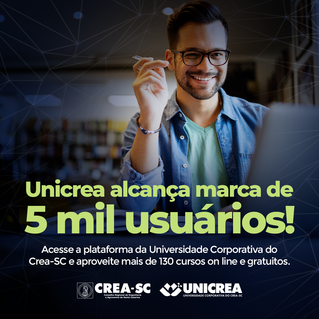 A Unicrea, a Universidade Corporativa do CREA-SC, desempenha um papel essencial no cenário de valorização e de aperfeiçoamento profissional para engenheiros, agrônomos e geocientistas registrados em Santa Catarina. Completando dois anos em abril e já ultrapassando 5 mil usuários, a Unicrea se consolidou como um modelo exemplar de capacitação contínua.