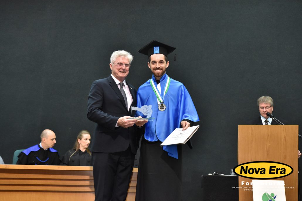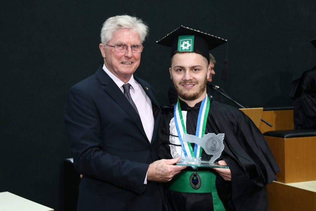 Os formandos Alex Chaves Grigolm, de engenharia civil e Daniel Rodrigo De Bastiani de agronomia, receberam do presidente um troféu de homenagem por terem obtido o melhor desempenho acadêmico das respectivas turmas.